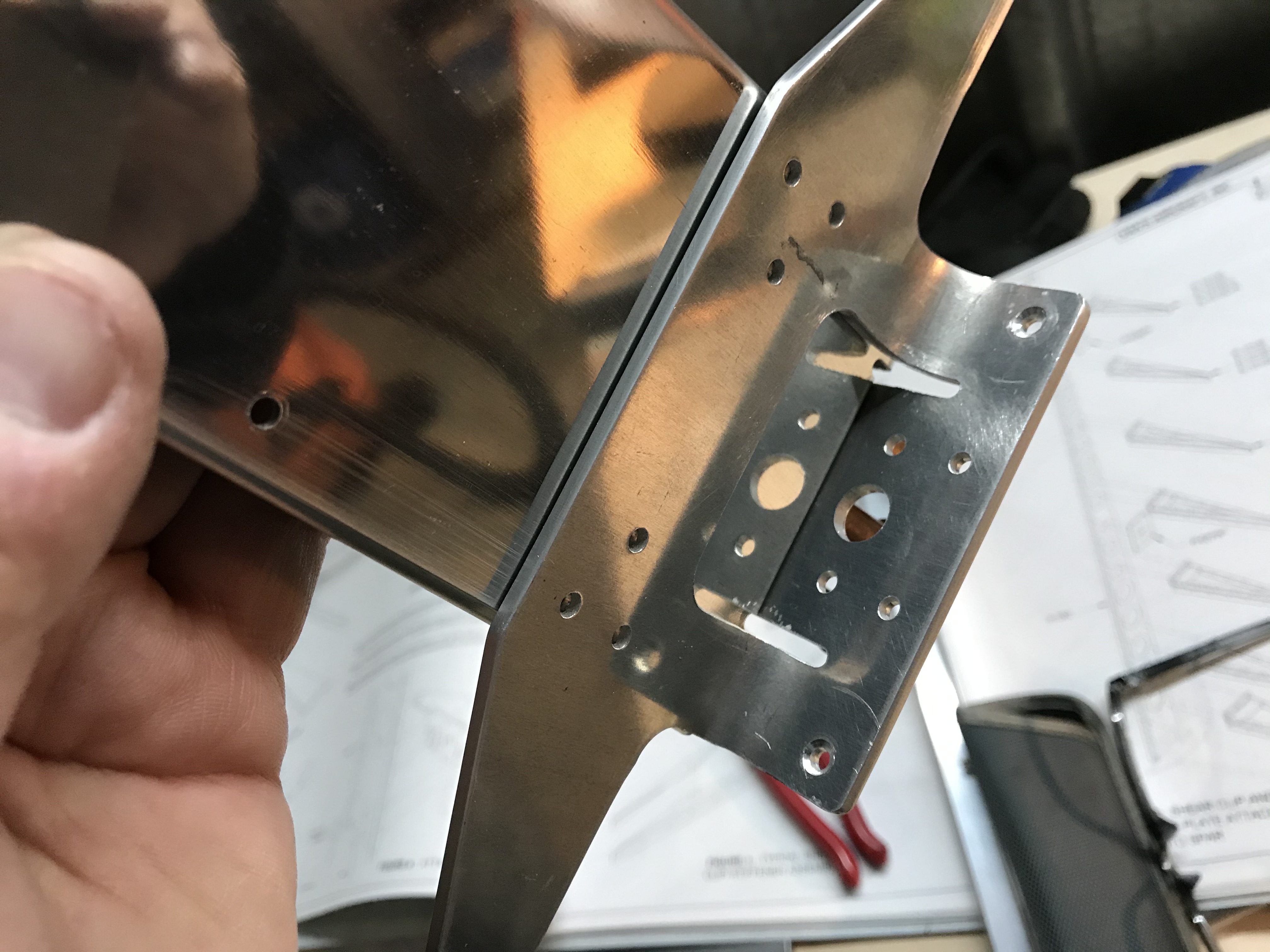 Today was roughly an hour of work re-learning how to adjust and use a counter-sink cage, and practicing on some scrap before drilling the first officially countersunk holes in the project, in the rudder horn (which, yes, needs more edge deburring).