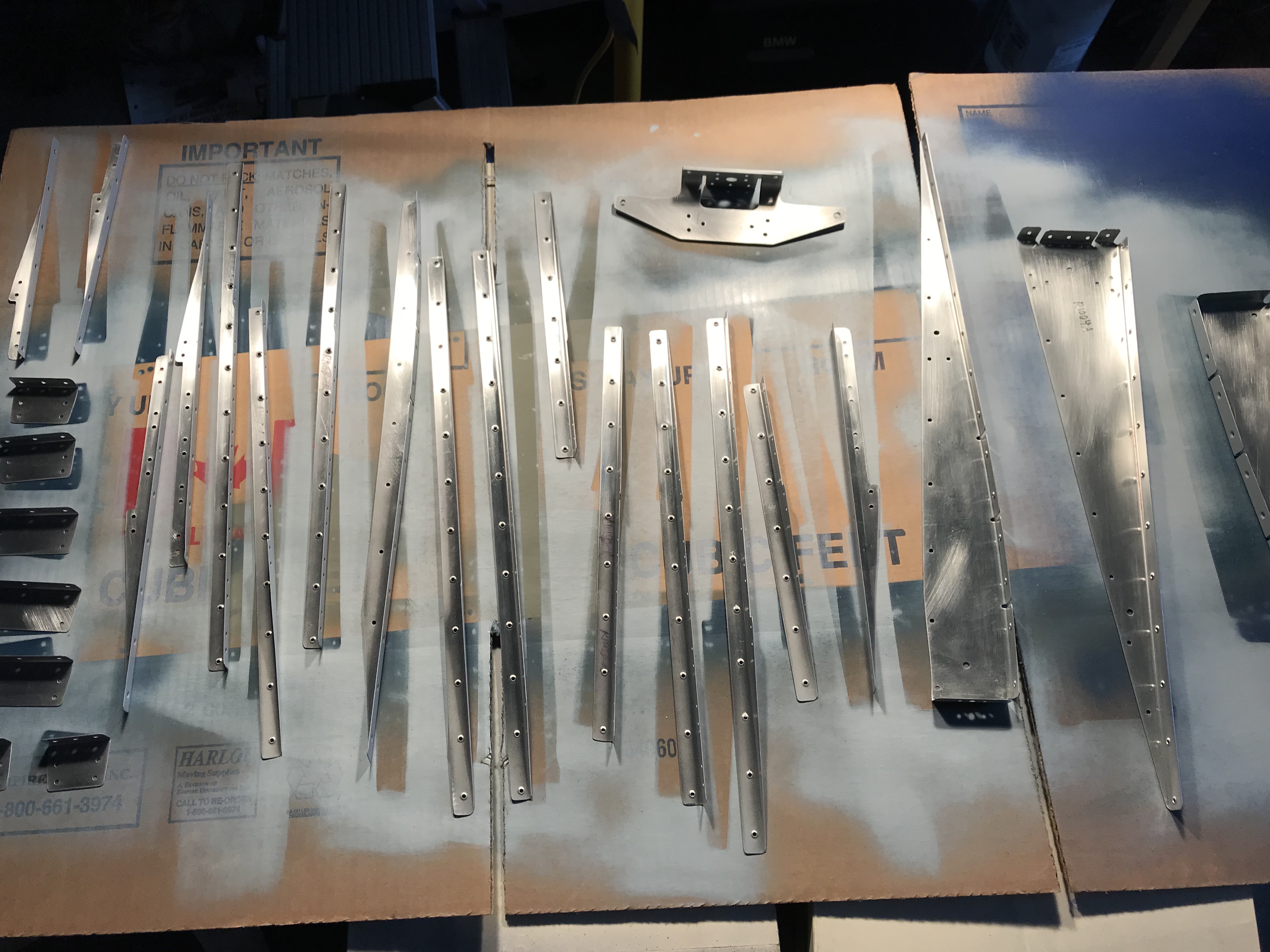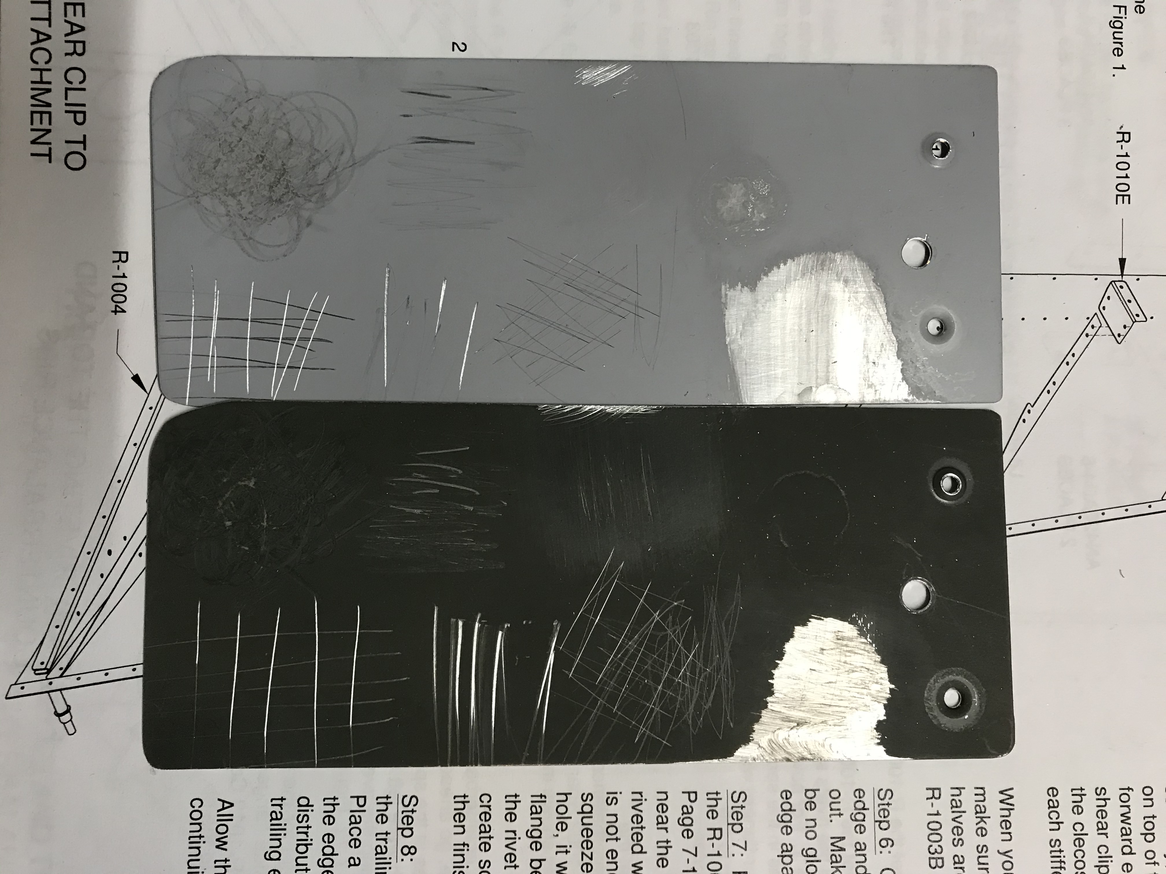 The alclad aluminum skins that are used in Van’s aircraft have a thin layer of pure aluminum on the surfaces. As long as it doesn’t get too scratched or damaged, it will have a good degree of corrosion resistance in atmosphere. I’m choosing to prime internal structures, e.g. ribs, stiffeners, stringers and the like with rattle-can primer (as well as any other parts Van’s recommends). I may also spray the rivet lines in the inside surfaces of the skins. But not the entire skins. The reason I want to spray the internal parts is that they tend to get a little more scratched and worn during the deburring process, more likely to expose the underlying alloy. This give a little more protection without a significant time investment.