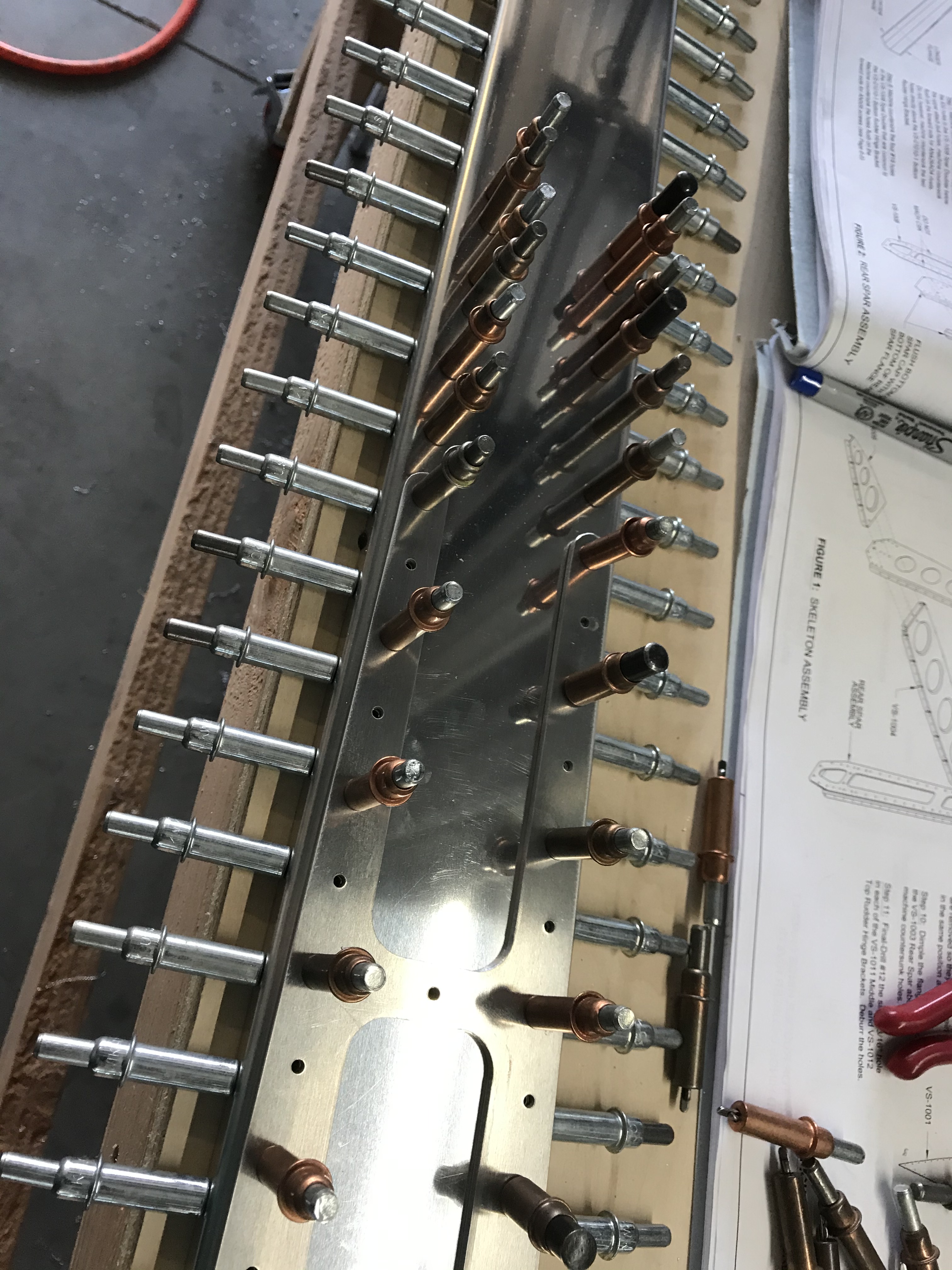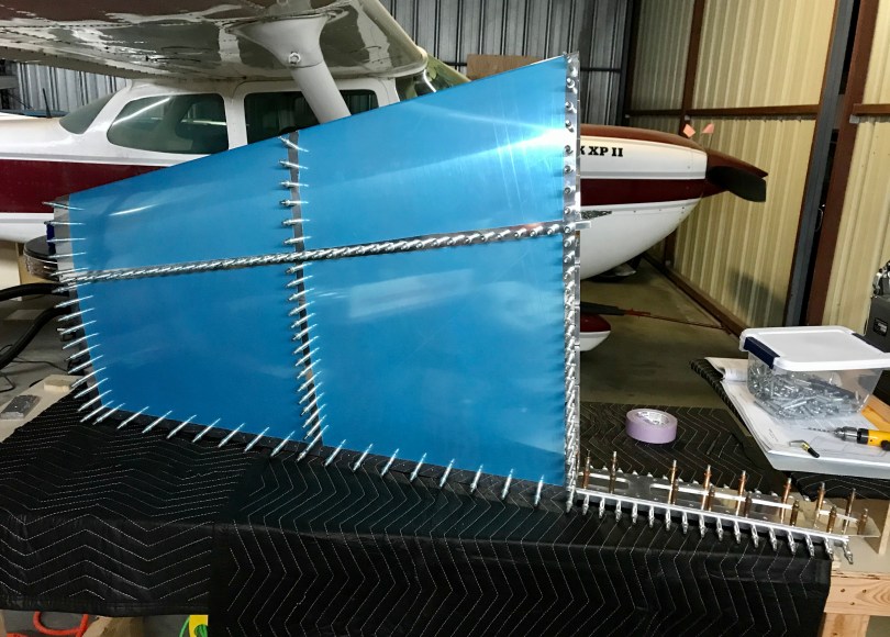 I cleco’d every hole, since this is such a tight fit, it really helped pull the skin into alignment. And even though my skin and most of my ribs are final hole sized, there is one piece that isn’t. So I have to final drill a row of rivet holes, and I thought it necessary to have the entire skin fit properly first.
