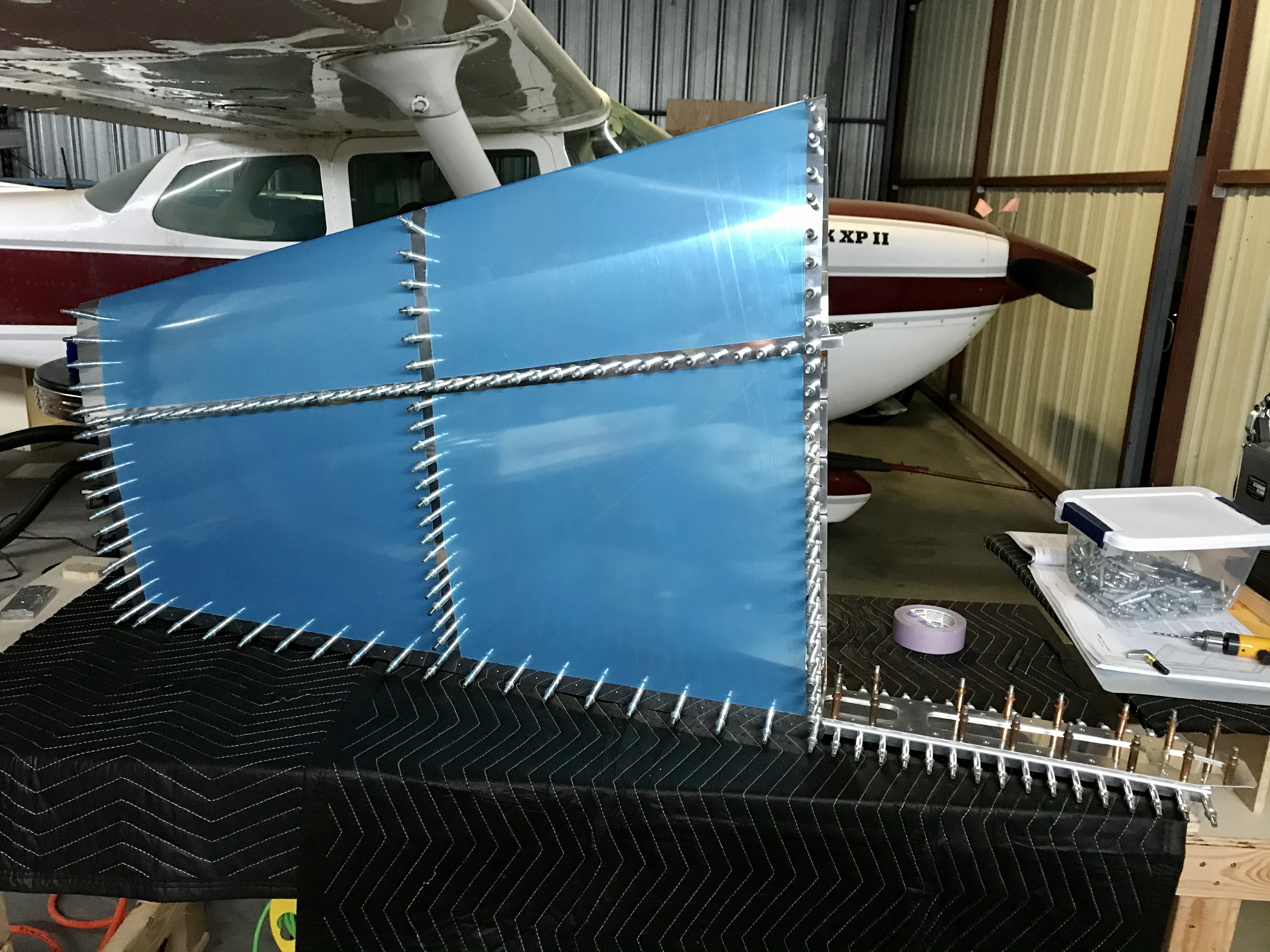 Then I deburred the edges of the ribs and front spar, and cleco’d the entire skeleton together. Now, after removing the vinyl from the Vertical Stabilizer skin, I was able to cleco it in place over the skeleton.