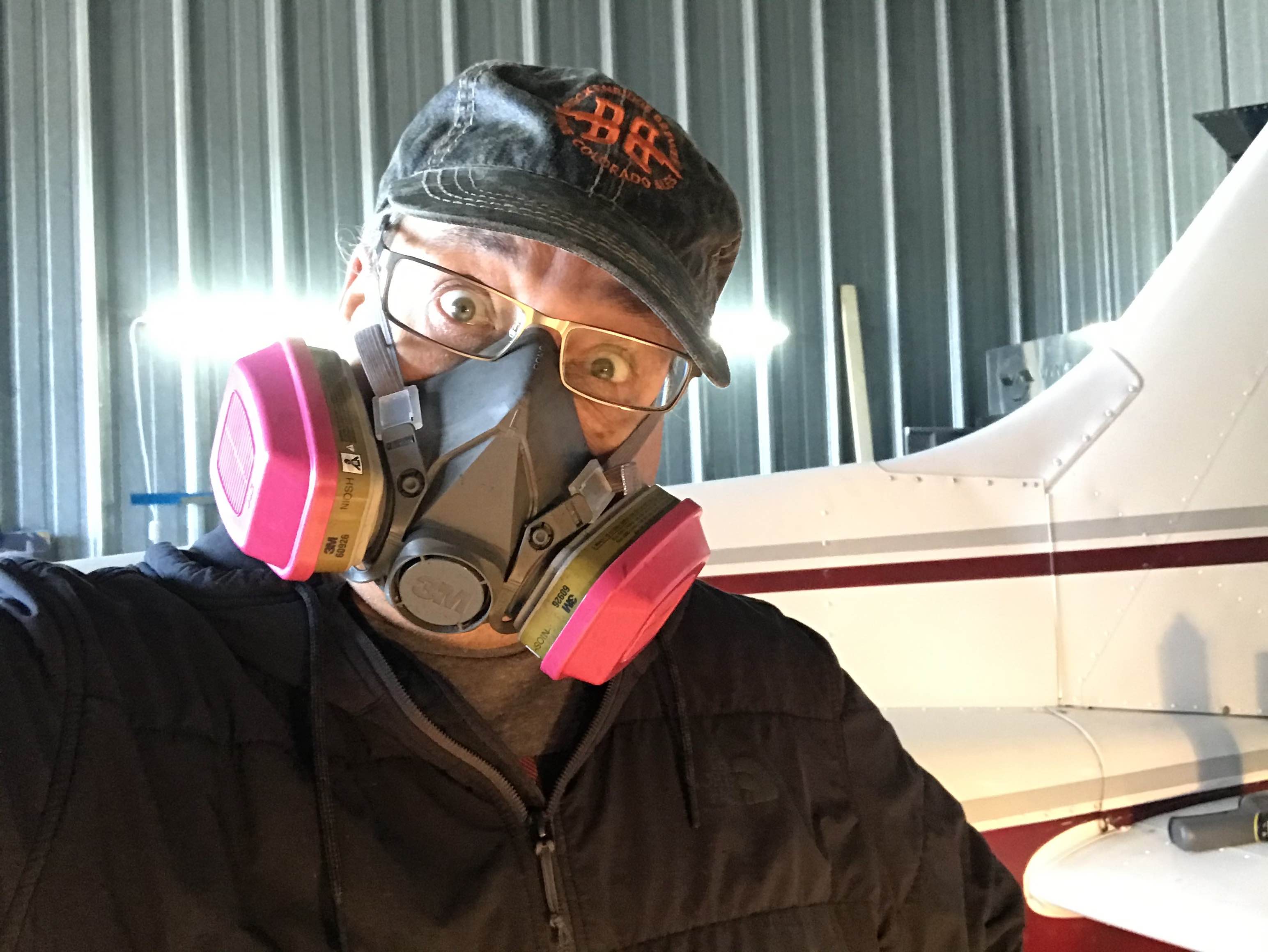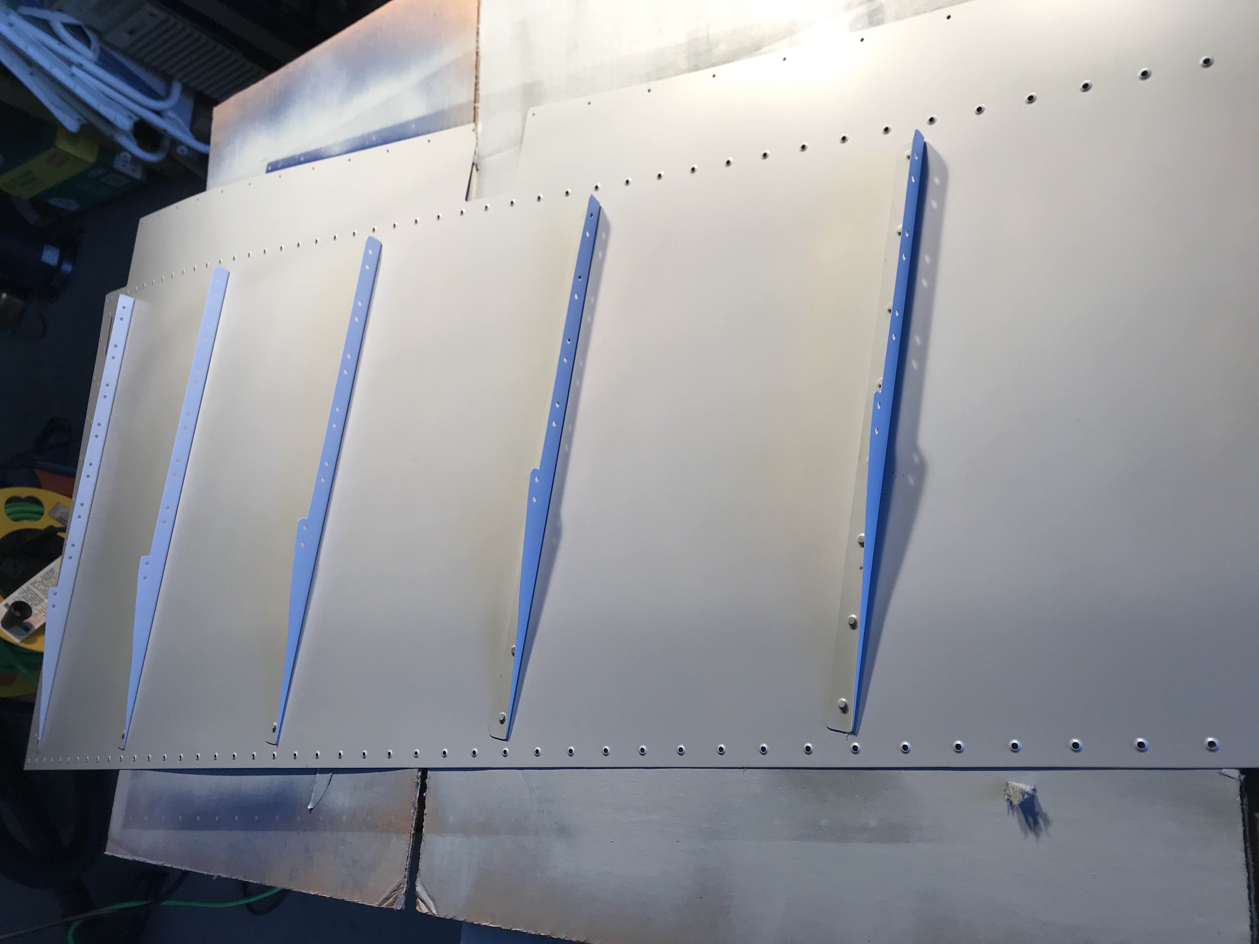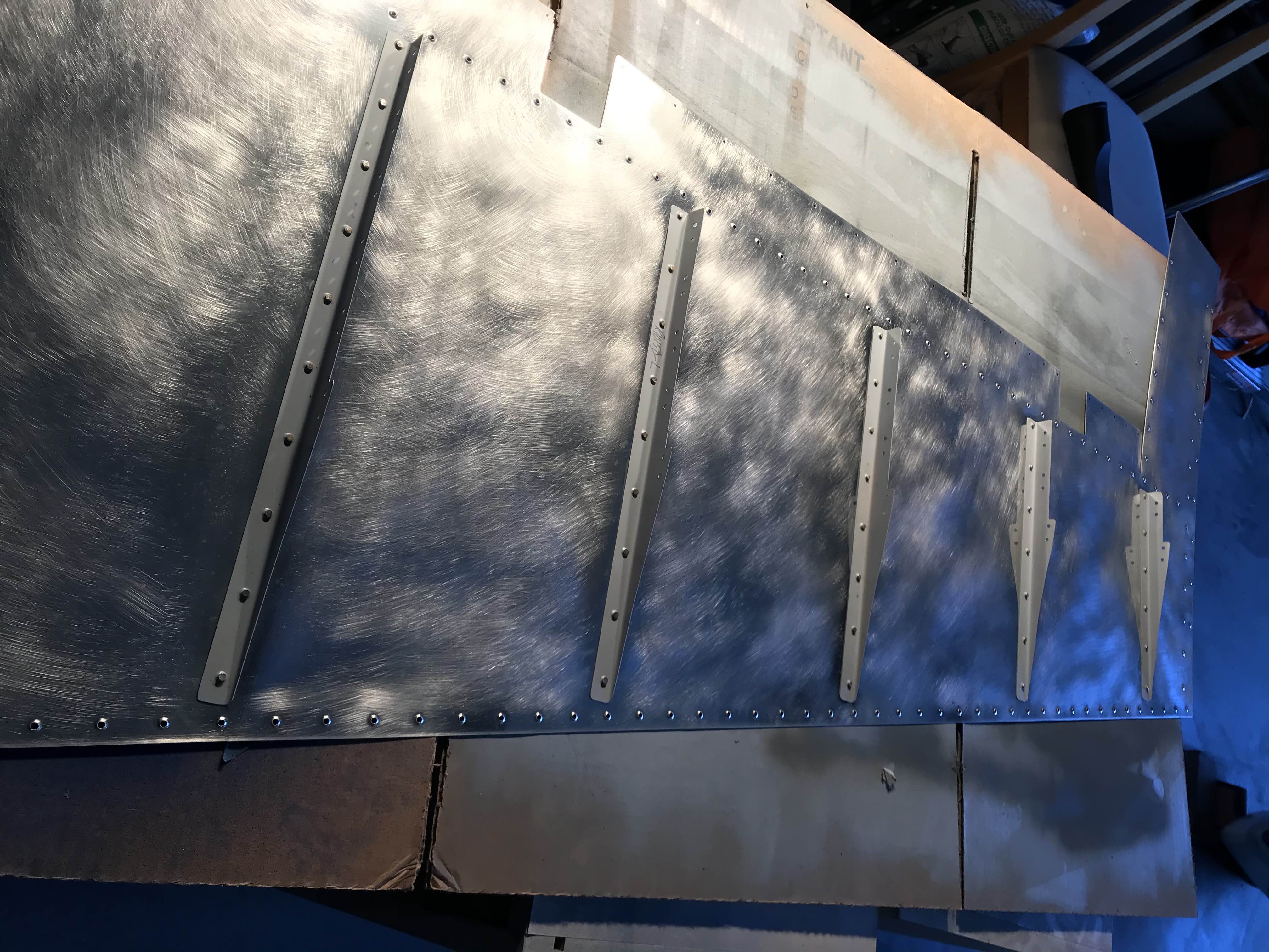 The new left rudder skin certainly does not bother me… I started by dimpling it. It was primed in the last session, and had no issues with dimpling after priming. I also re-made 3 stiffeners. Got those primed, and riveted all the stiffeners on the left rudder skin. Because I did not prime the right skin, I decided that I wanted to now, so I lightly scuffed it, cleaned, and sprayed. It was very lightly scuffed with a gray scotch-brite, the strong halogen lighting just makes it look more aggressive.