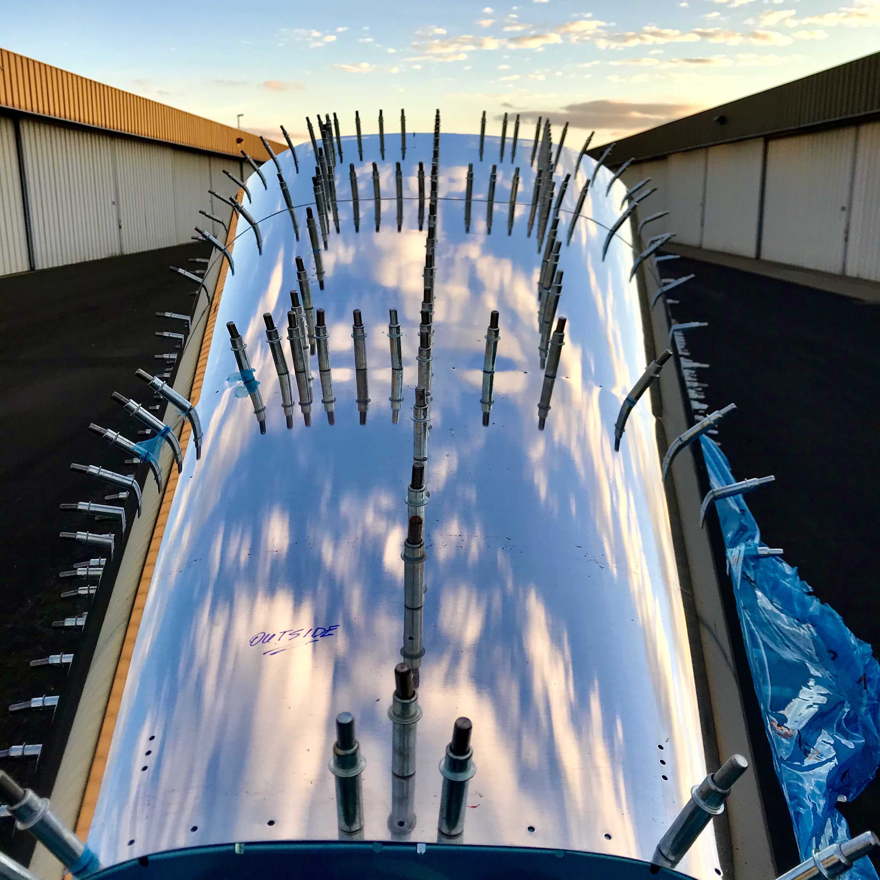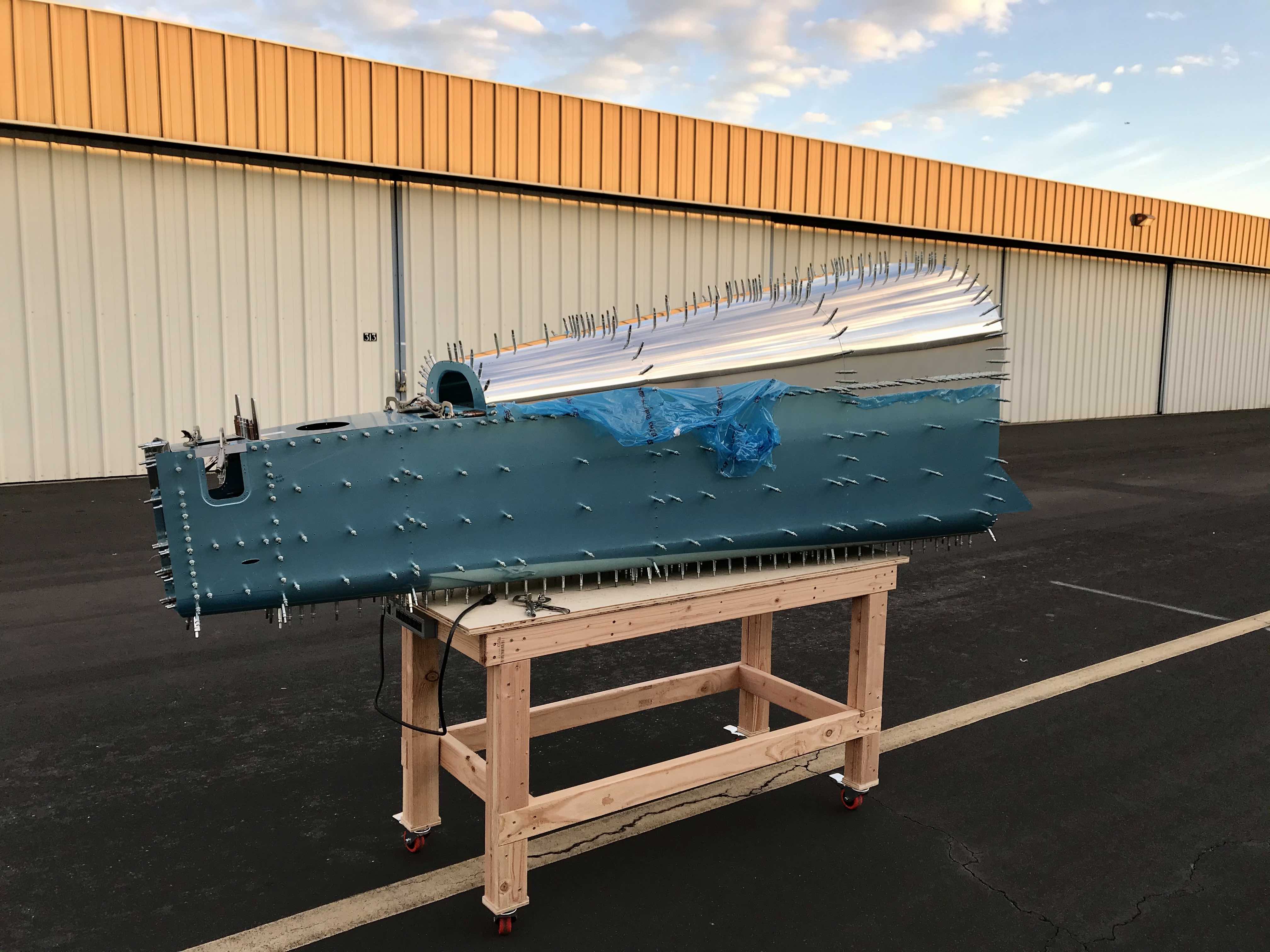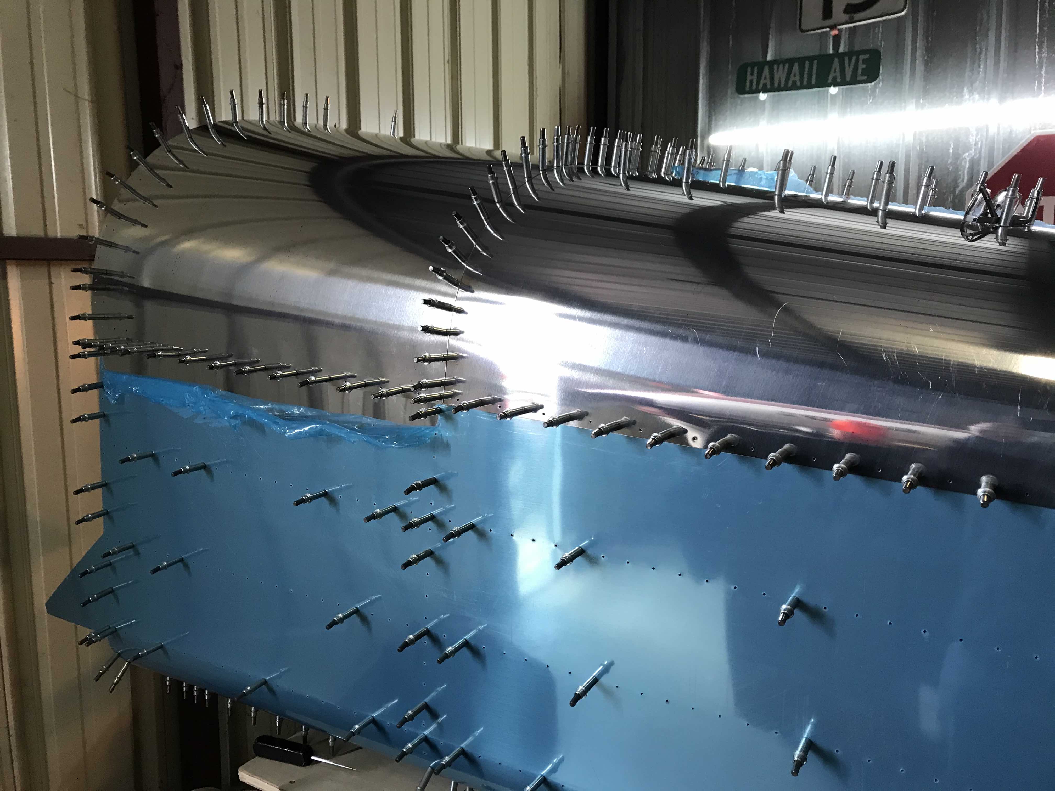 Today started by match-drilling the aft top tailcone skin to the three top J-stiffeners. Then came the time consuming task of fitting the front top tailcone skin onto the cone. It was a bit of a challenge getting everything to line up and the clecos to engage properly, but just required patience and was something that couldn’t be rushed. Then the sections of the three top J-stiffeners had to be match drilled to that skin as well. Finally, the holes where the top skins meet the side skins and longerons had to be final drilled from 3/32″ to #40.