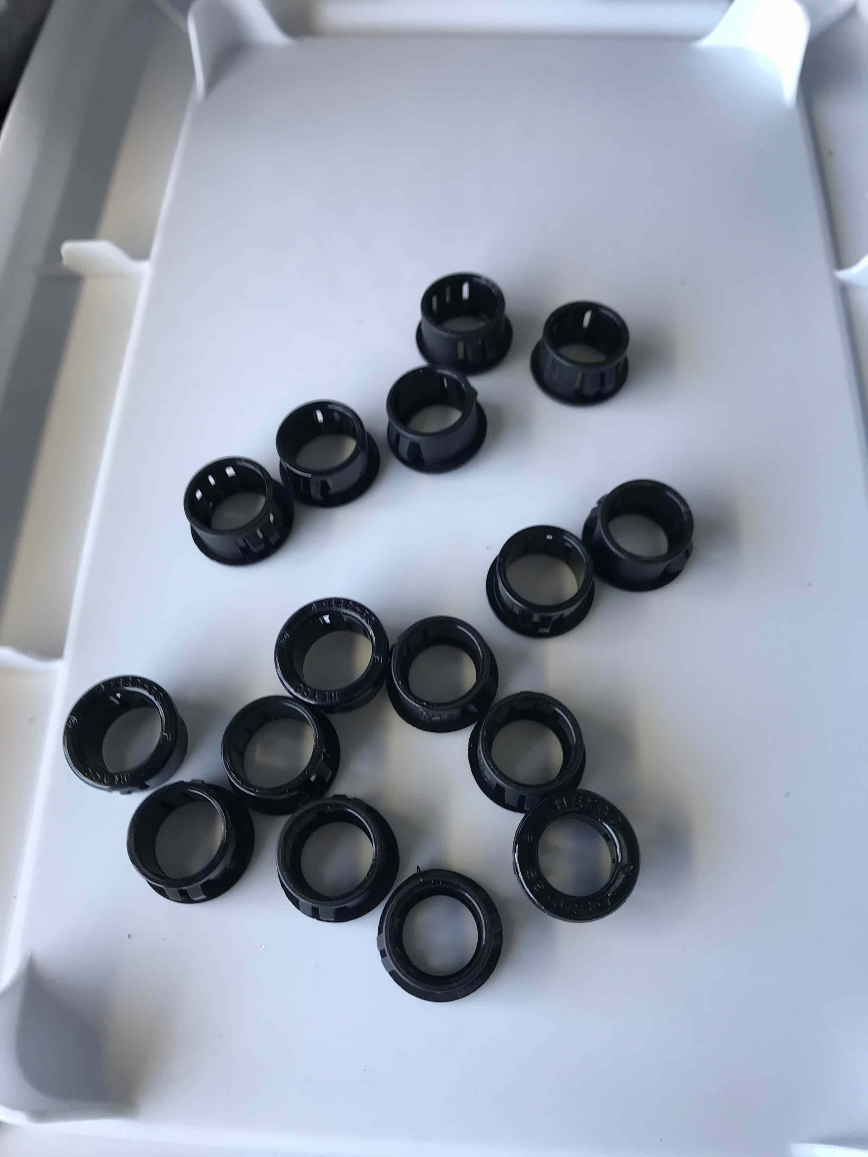 Just a couple of hours in the shop today. Riveted together the pieces of the large bulkheads that I could. F-1008 cannot be fully done as I’m missing the rudder cable bracket (backordered), and F-1006 is not meant to be fully done at this time. Also realized I hadn’t yet dimpled the flanges of the bulkheads, so got that done. Finally, had to find and install a pair of 7/16″ snap bushings from a baggie of mixed 1/2″ plus 7/16″ bushings. Could not visually distinguish, so I used my trusty digital calipers. However, after viewing the pictures after the fact I now see that the size indications are stamped onto the parts.