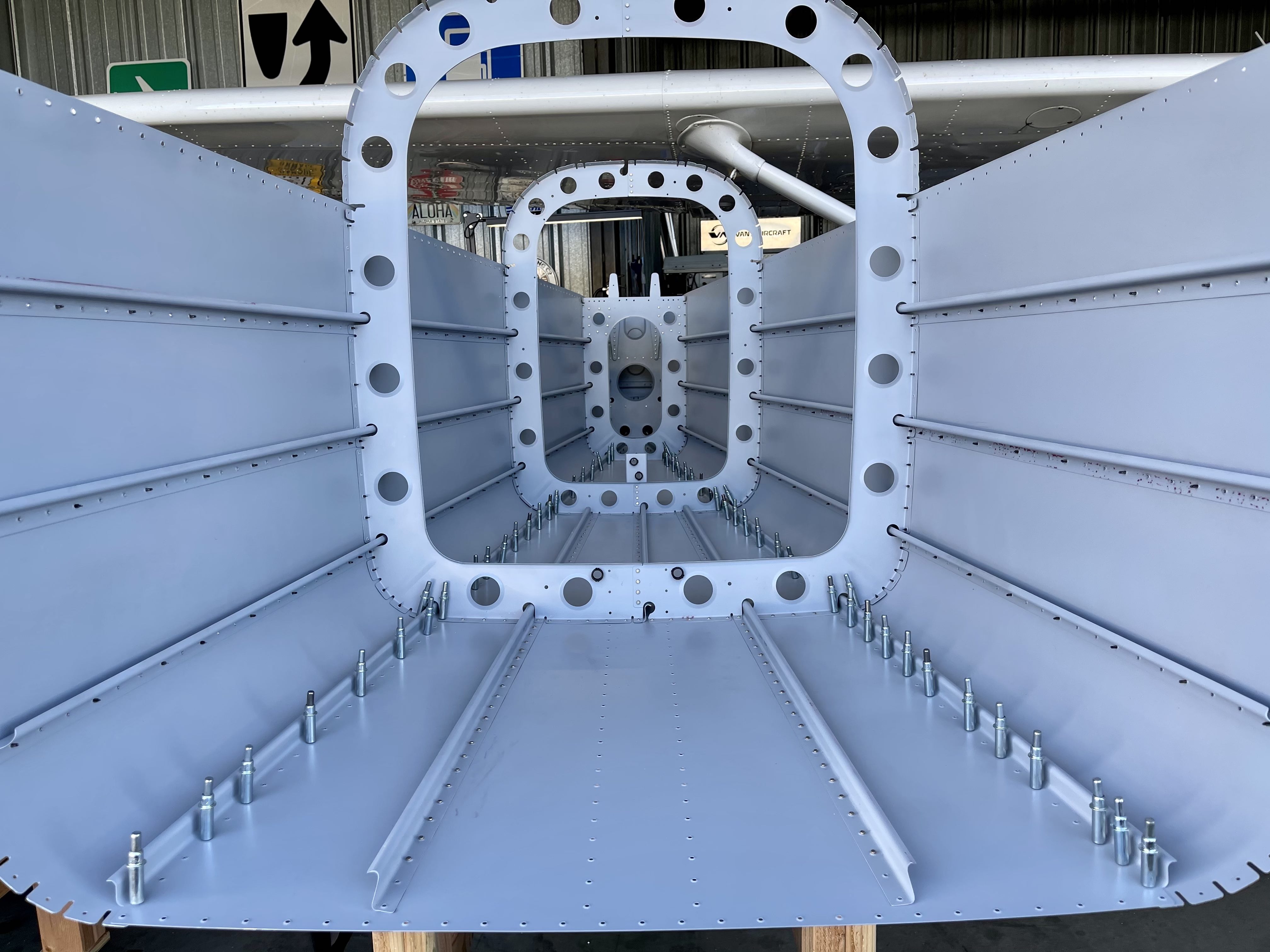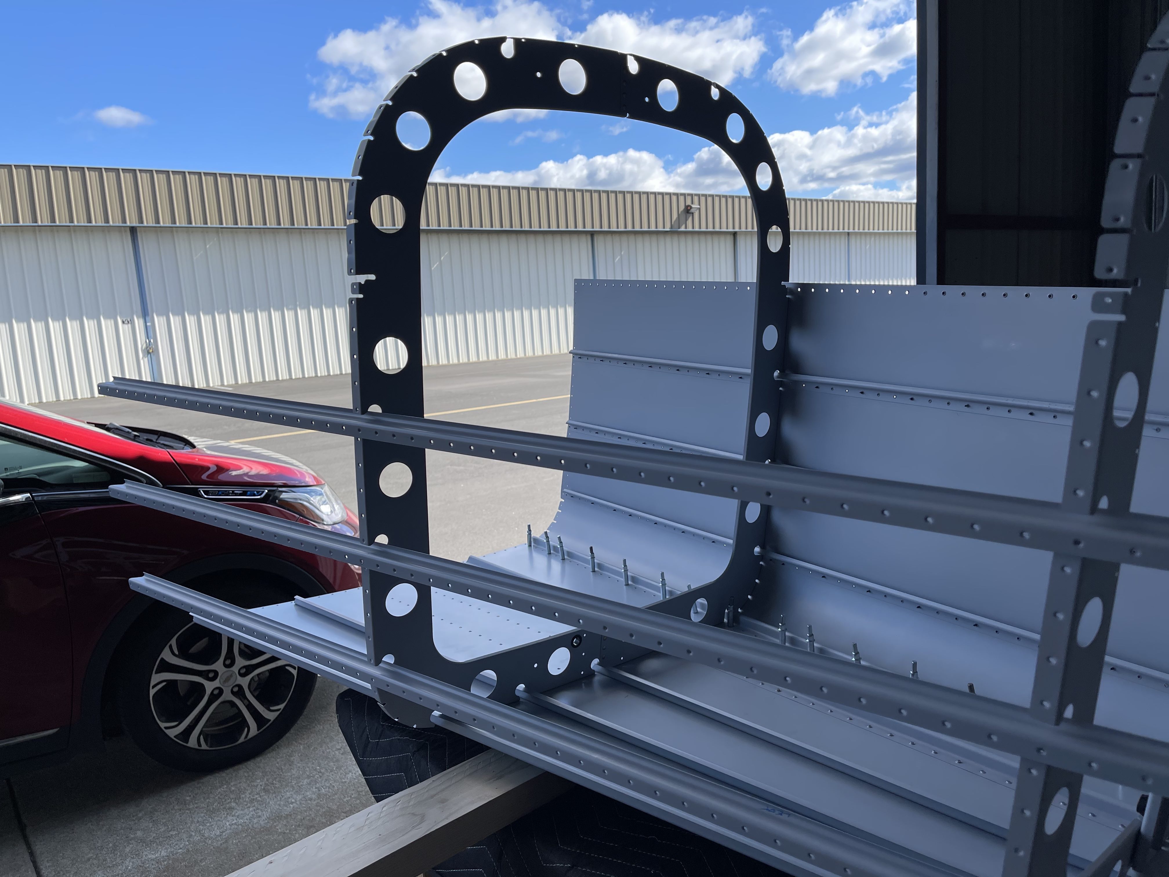 Finished riveting stiffeners and bulkheads to the bottom tailcone skin. There were a couple of problem areas that required drilling and re-setting.