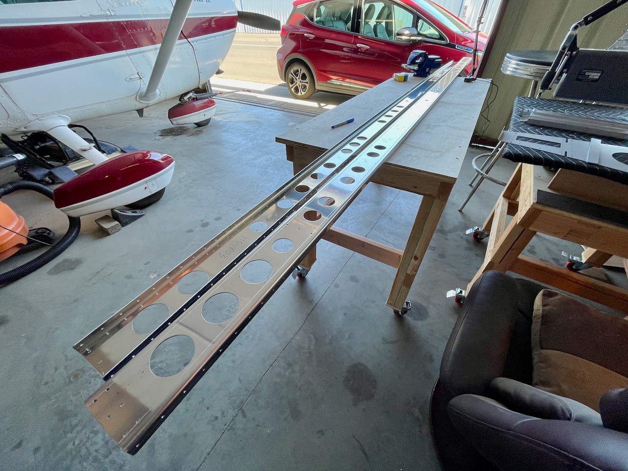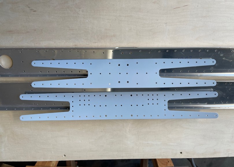 The spars were much more time consuming. They are also very long (>11′). I first used a file to take down the “punch nibs,” followed by the Dremel with a sandpaper wheel, then by hand with a couple of smoother grits of sandpaper then a Scotch Brite pad.