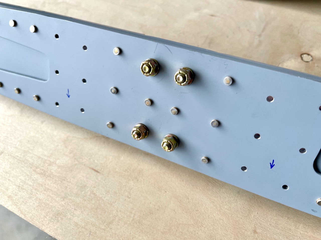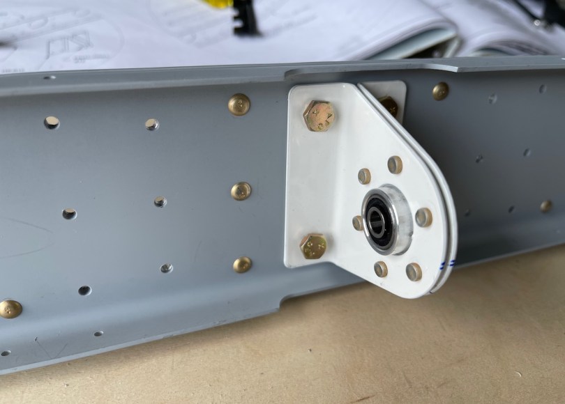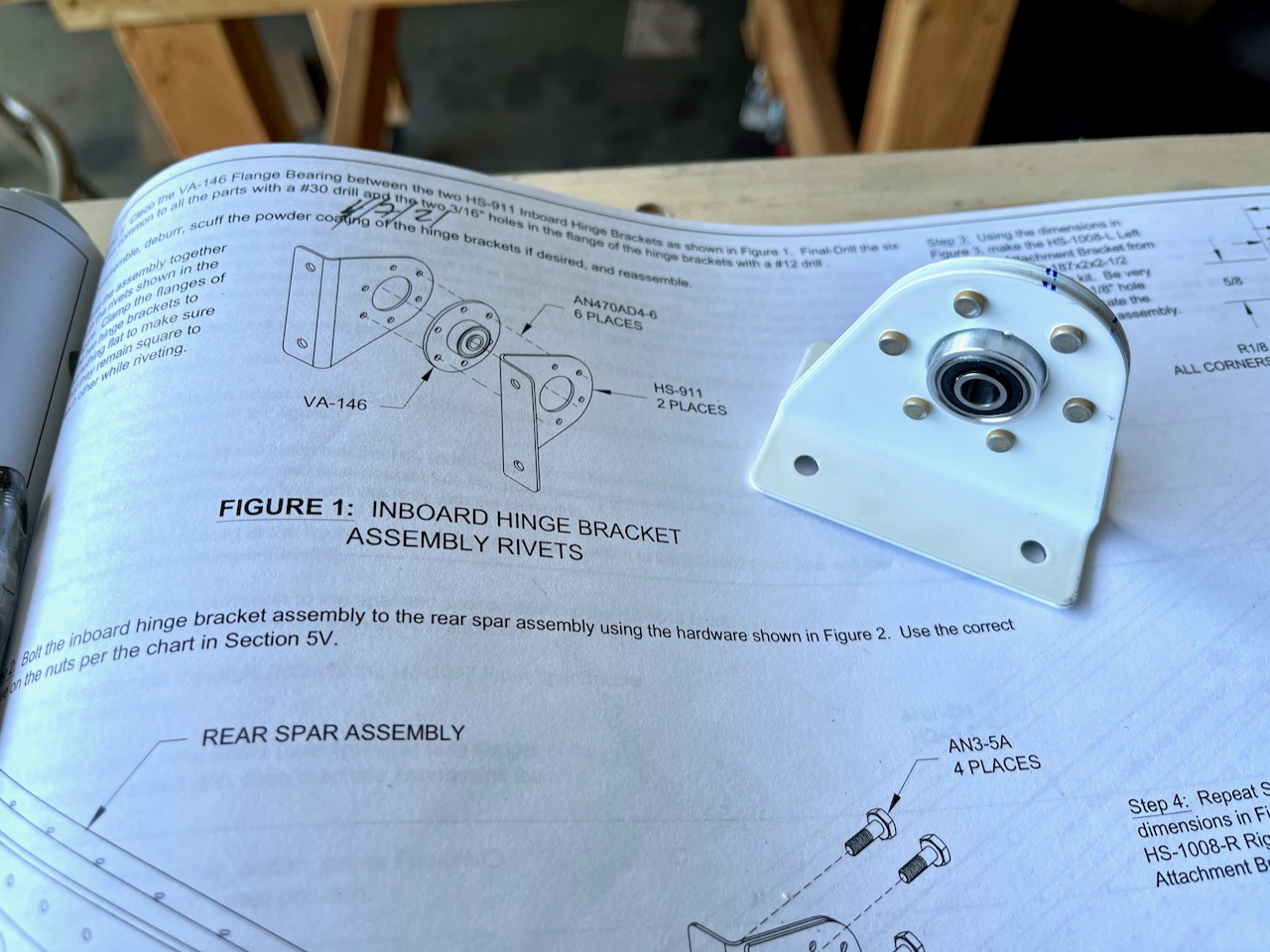 Continued work on the spars for the horizontal stabilizer. One last task on the rear spar — assembling the elevator bearing assembly. Quick and easy, just final size drilling, deburring and riveting. Bolted onto rear spar, but did not torque the nuts as my existing torque wrench is too large (used for oil filter, spark plugs, etc). I ordered a smaller one, calibrated in inch-lbs.