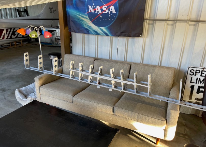 Riveted most of the ribs to the front spar of the Horizontal Stabilizer (except the outboard 2 on each side which wait until later). Then let the skeleton rest on the sofa for a bit while the workbenches were occupied with the horizontal stabilizer skins, as I started to rivet the nose ribs in place.
