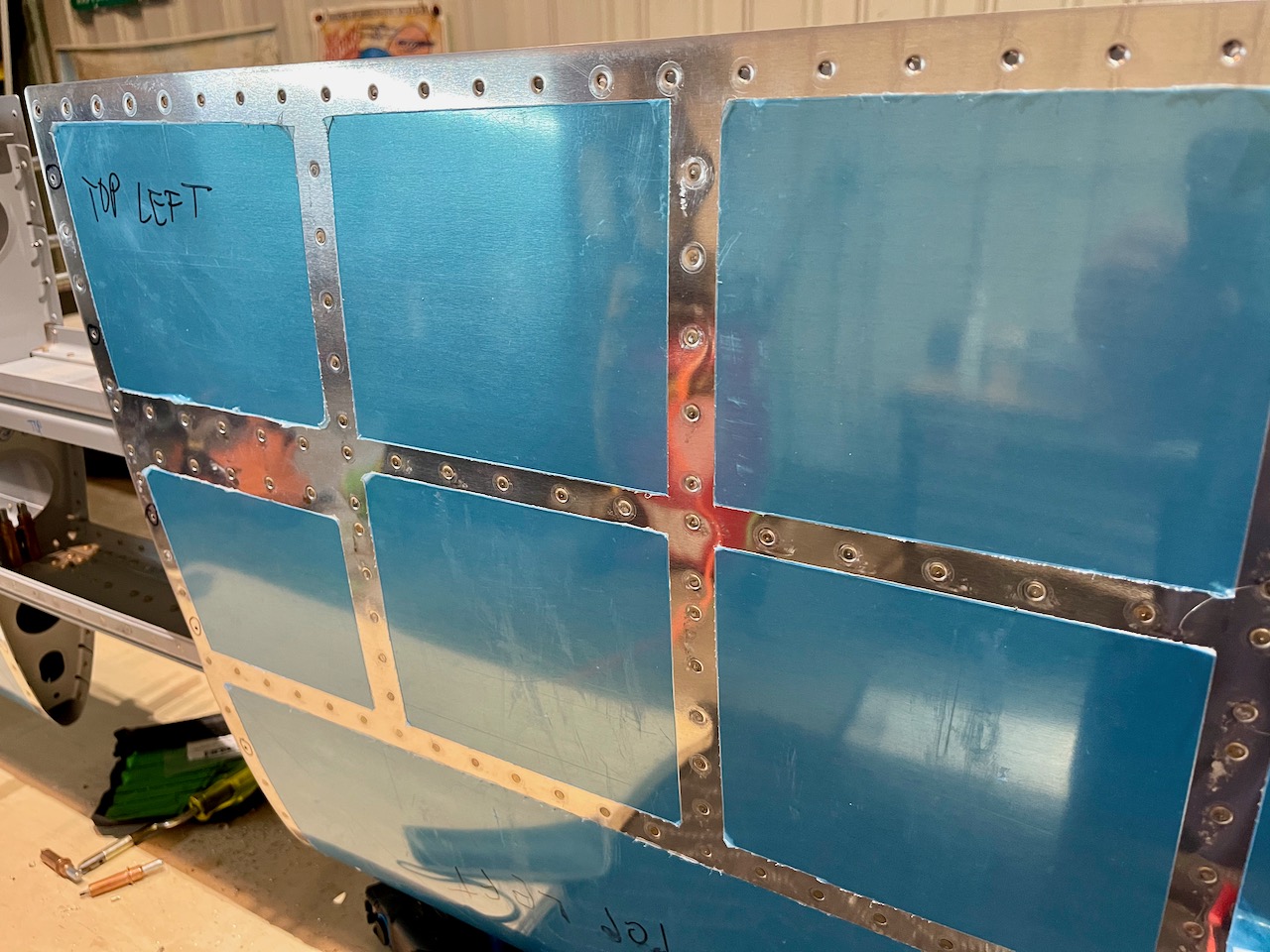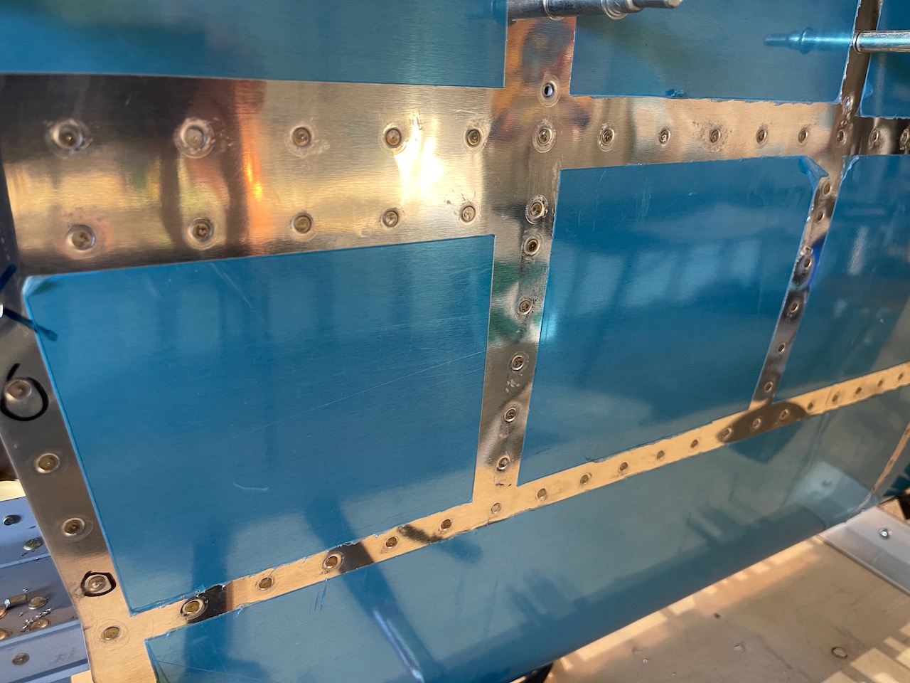 A full day riveting the horizontal stabilizer skins to the skeleton. Still more to do, it’s very time consuming, especially when taking a few breaks in the 90 degree heat. Did have the advantage of being able to open doors against two separate walls to get a bit of a cross-breeze in this corner hangar… and that was fine until the wind started picking up too much.