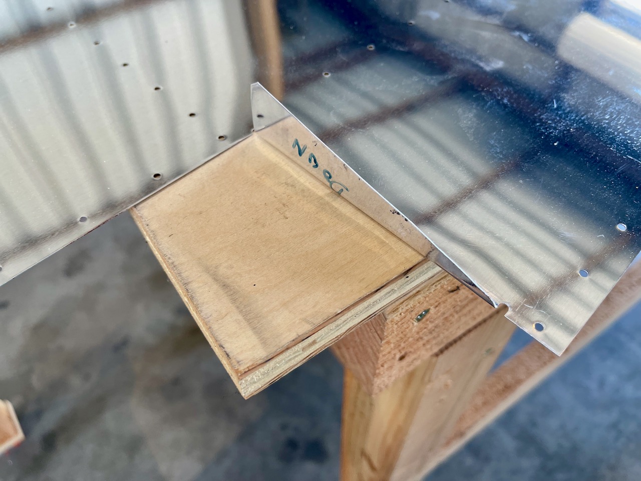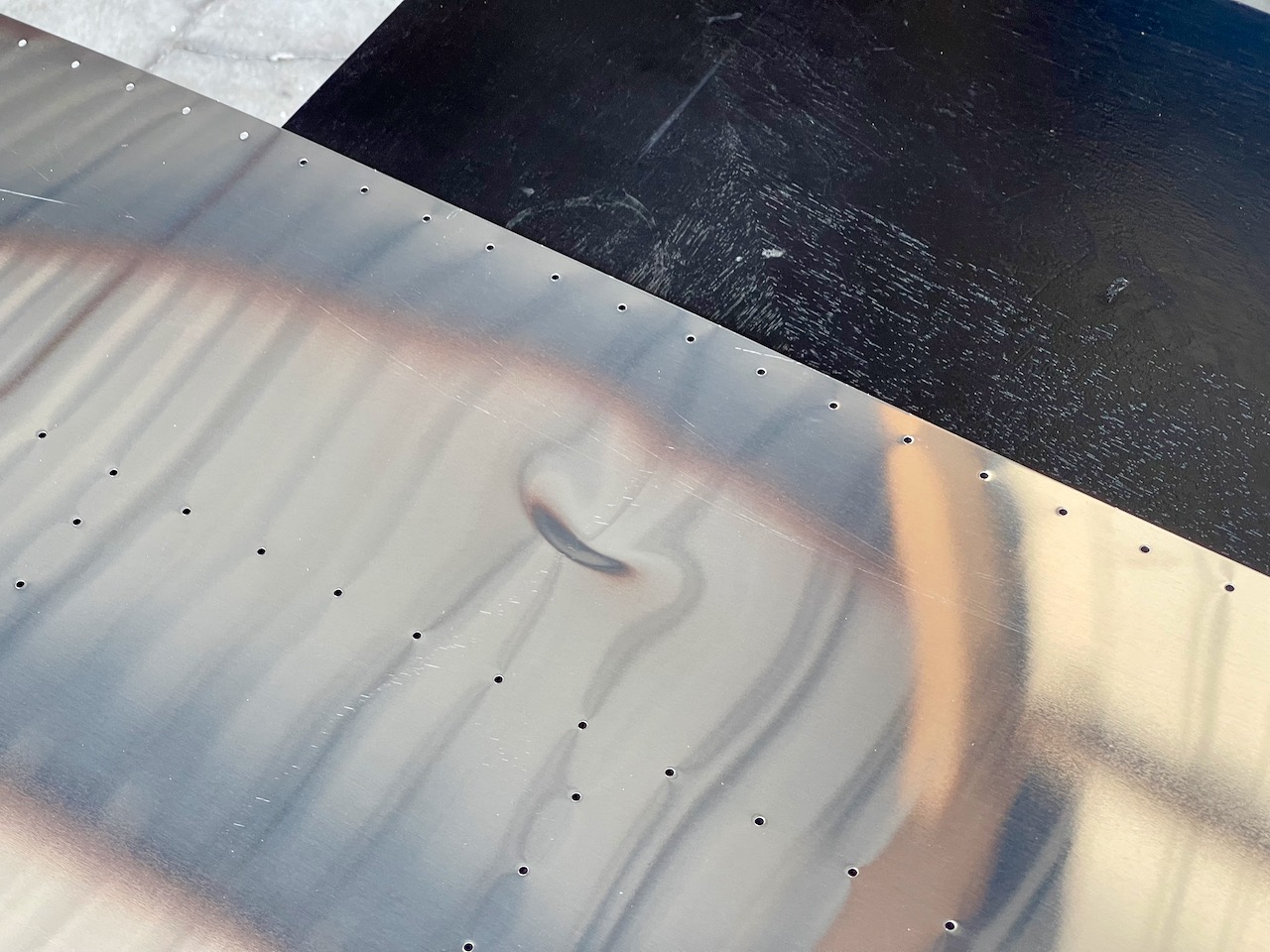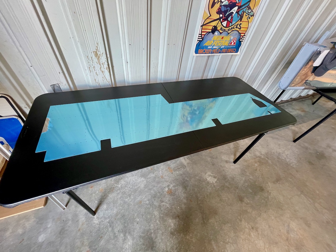 Starting the elevators in earnest. Started with peeling the vinyl from 4 skins (2 top, 2 bottom). Unfortunately, got too aggressive on one of the skins, as the vinyl is firmly in place and the skin is very thin (0.016″). So… one little crease. Tried to knock it out, and it’s not bad but not perfect (not pictured either). Since it’s a control surface, I do not want to really fill it if at all possible. Replacement skin is only $30, so I might go with that.