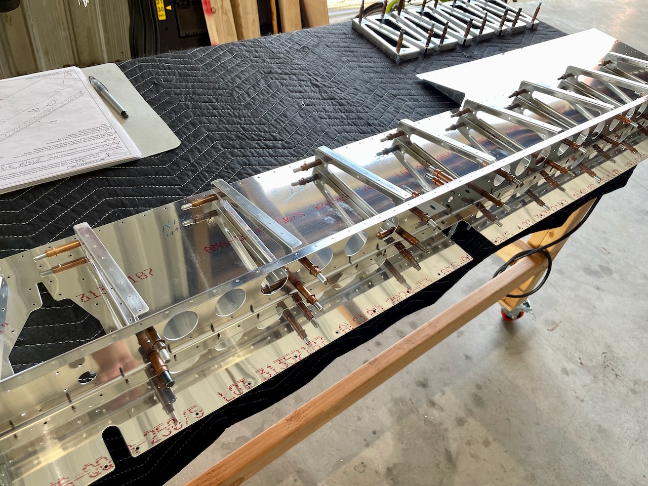 Anyway, it was just a little bit of work to bend some tabs on 4 skins, and to cleco the ribs (that were prepared a while back) in place.