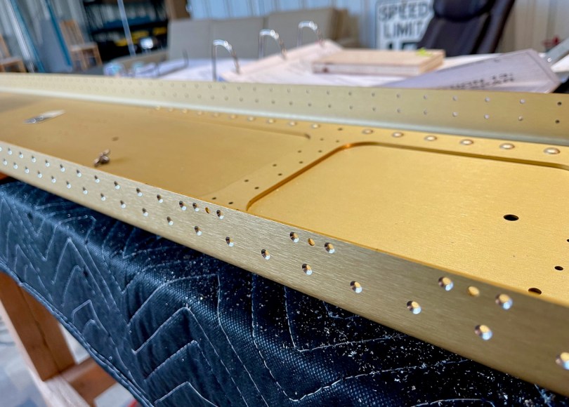 Then it was time to countersink all the #40 nutplate holes on the spar flanges for an AD3 rivet (and some other holes lined up with them). The remaining #40 holes were also countersunk, but a little bit deeper, as they will take a dimpled skin rather than just a rivet.