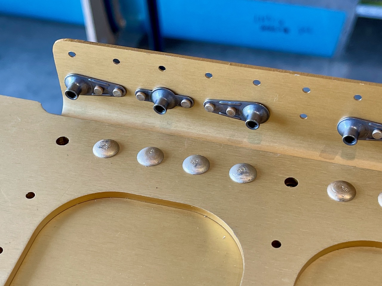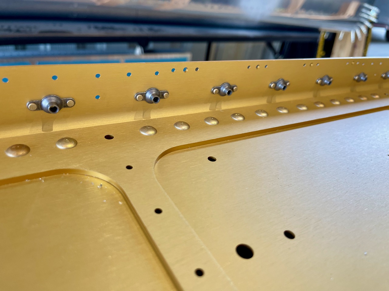 Today was spent riveting nutplates to the left wing spar. Two different sizes, one size for the fuel tank attachment screws (#8, two different styles) and another size (#6) for the wing inspection panels. Used the pneumatic squeezer for the nutplates which made for nice consistent rivets.