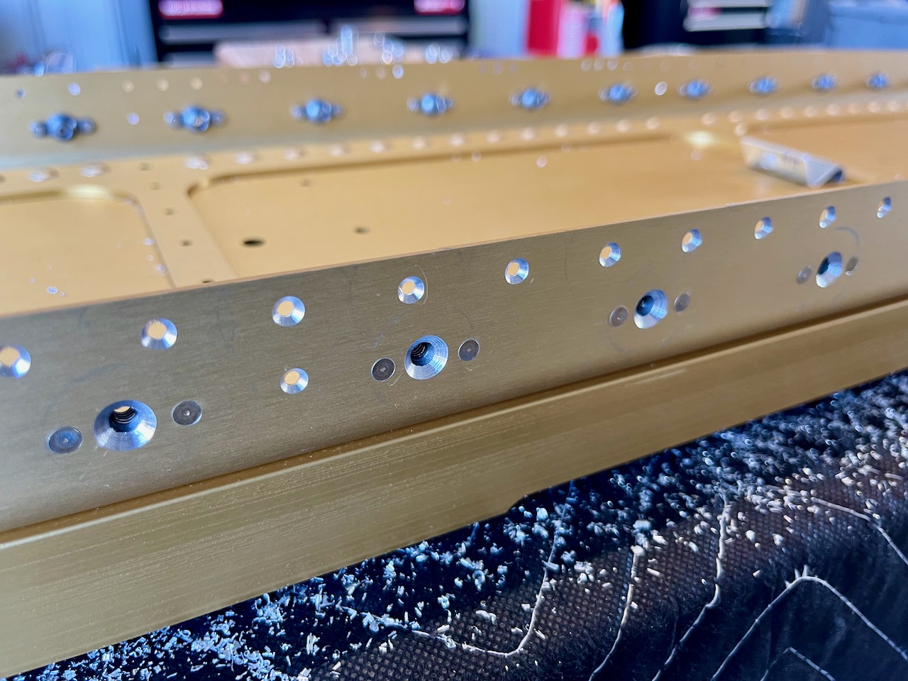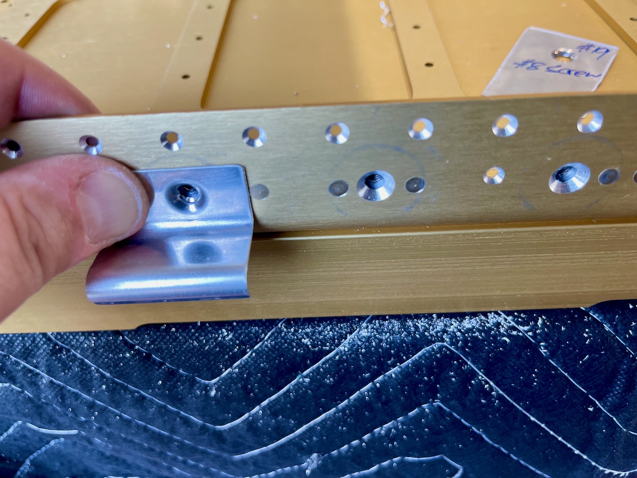 Then it was time to countersink the screw holes of the installed nutplates. These must be big enough to accommodate skin dimples for #8 and #6 screws, and the plans call for making a template for each of these. The countersinks for these end up being pretty deep but the plans also specify the maximum inner and outer diameter of the screw hole and countersink which is a good cross-check.