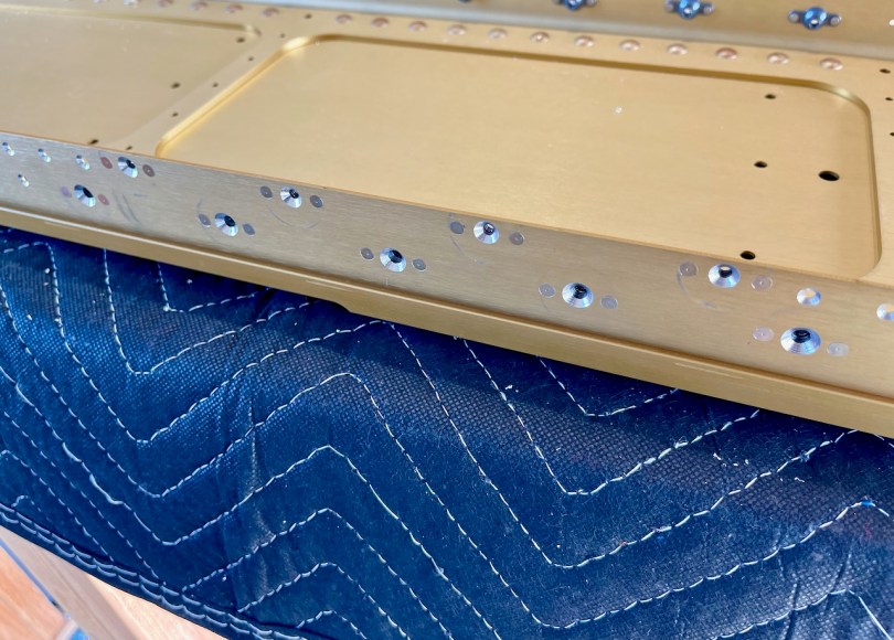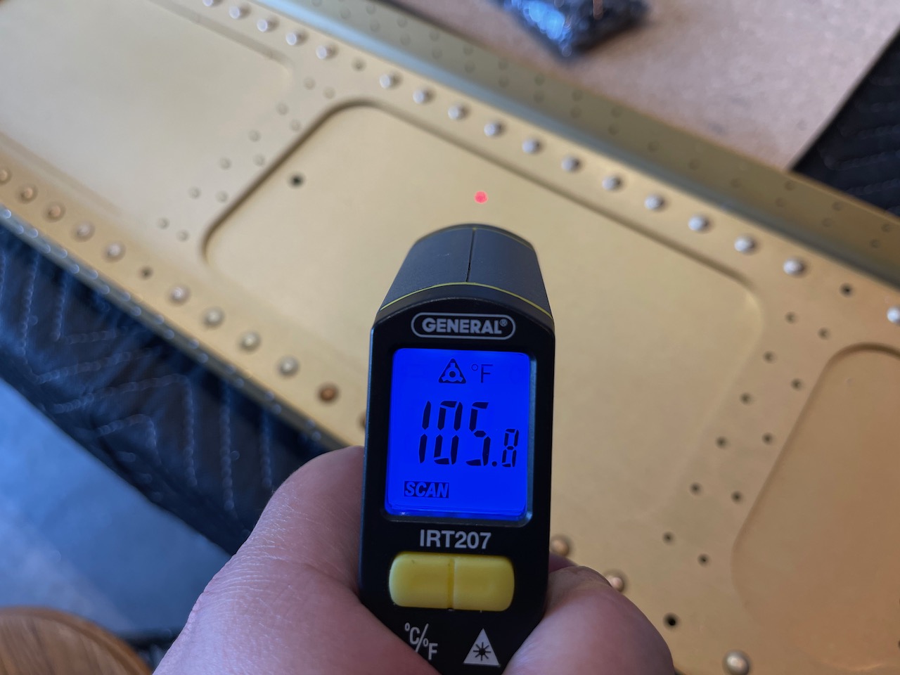 A hot, hot day in the hangar today, so took quite a few hydration breaks. This is a north-facing hangar, but it still ends up being warmer inside the hangar than the outside temperature on a sunny day… radiant heat from the roof. It’s a corner hangar too, and has a west facing wall. The outside air temperature was ~100F but we got ~107F inside, and even the parts got pretty warm to the touch (~105F!). The temperature of the west-facing roll-up door was 120F. Whew!