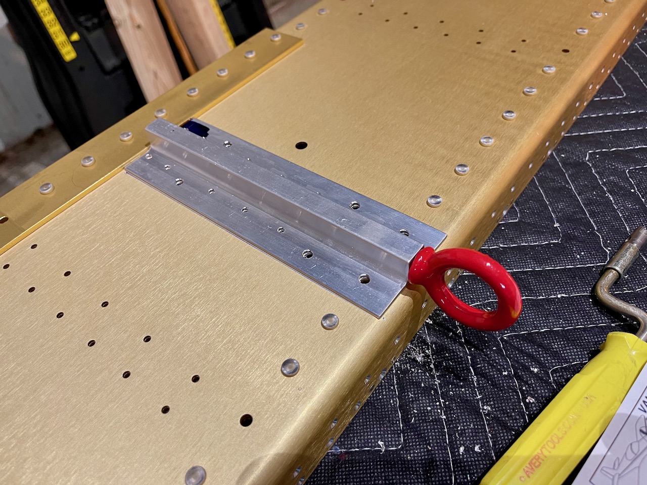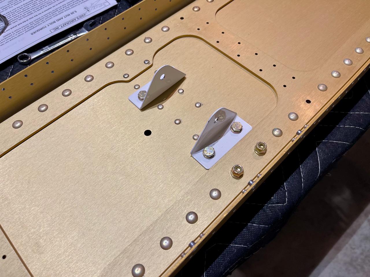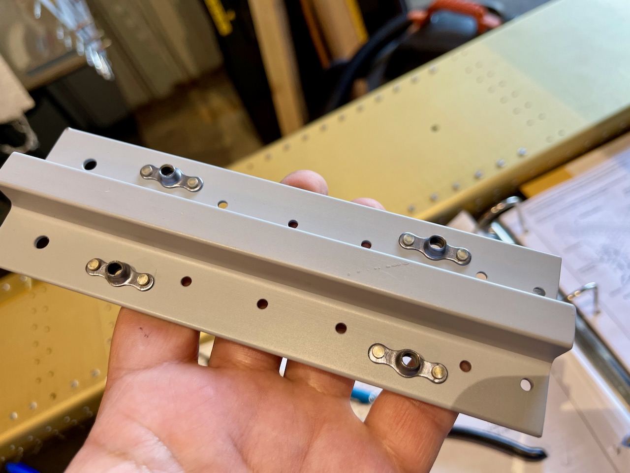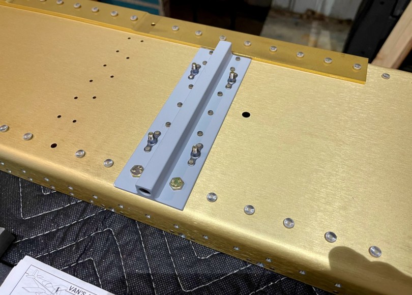 Wrapping up the left wing spar prep involved countersinking and riveting a few nutplates on the inboard end. Then it was preparing the tie-down blocks by match drilling, priming, countersinking for nutplates, riveting nutplates, and riveting to the spar. Attaching a couple of brackets with bolts completed the deal.