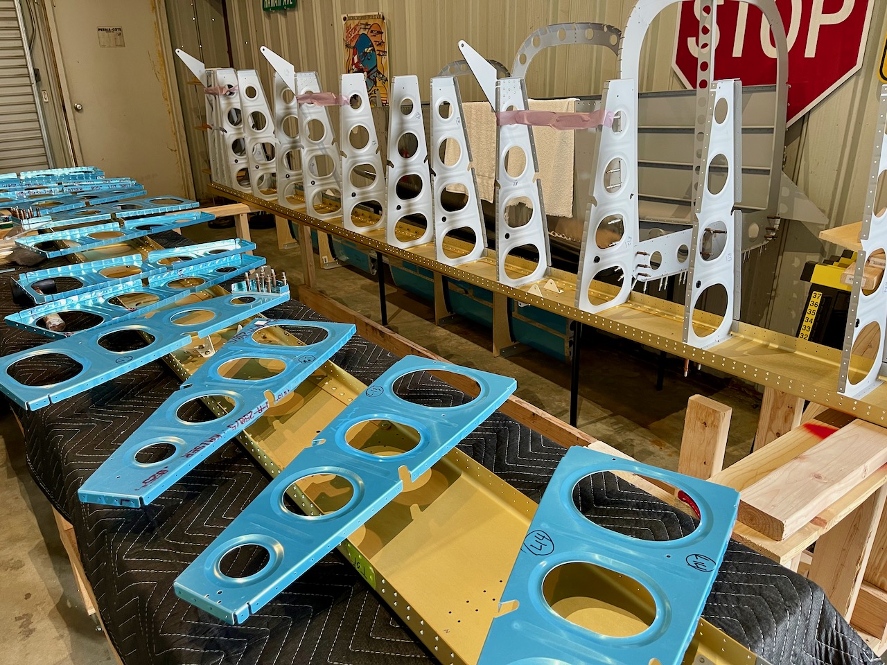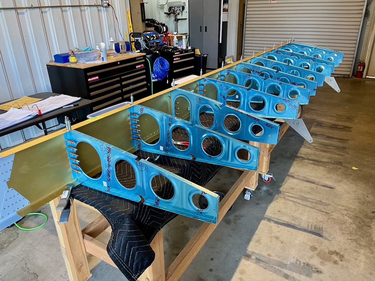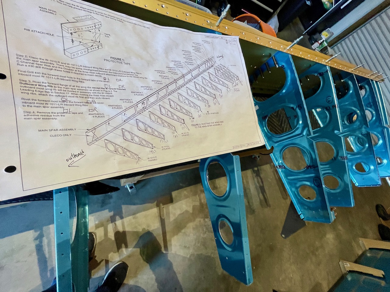 Finally resuming work on the left wing. It was a beautiful day today and nice and warm in the hangar. Spent time assigning the appropriate wing rib parts to their specific positions on the spar, clecoing them in place, and them match drilling #12 holes for bolts. Again the #30 and #40 holes are final sized so no drilling required there. Also pulled off the blue vinyl from the wing ribs, and finally begun the deburring and priming process on three of the smaller parts (brackets).