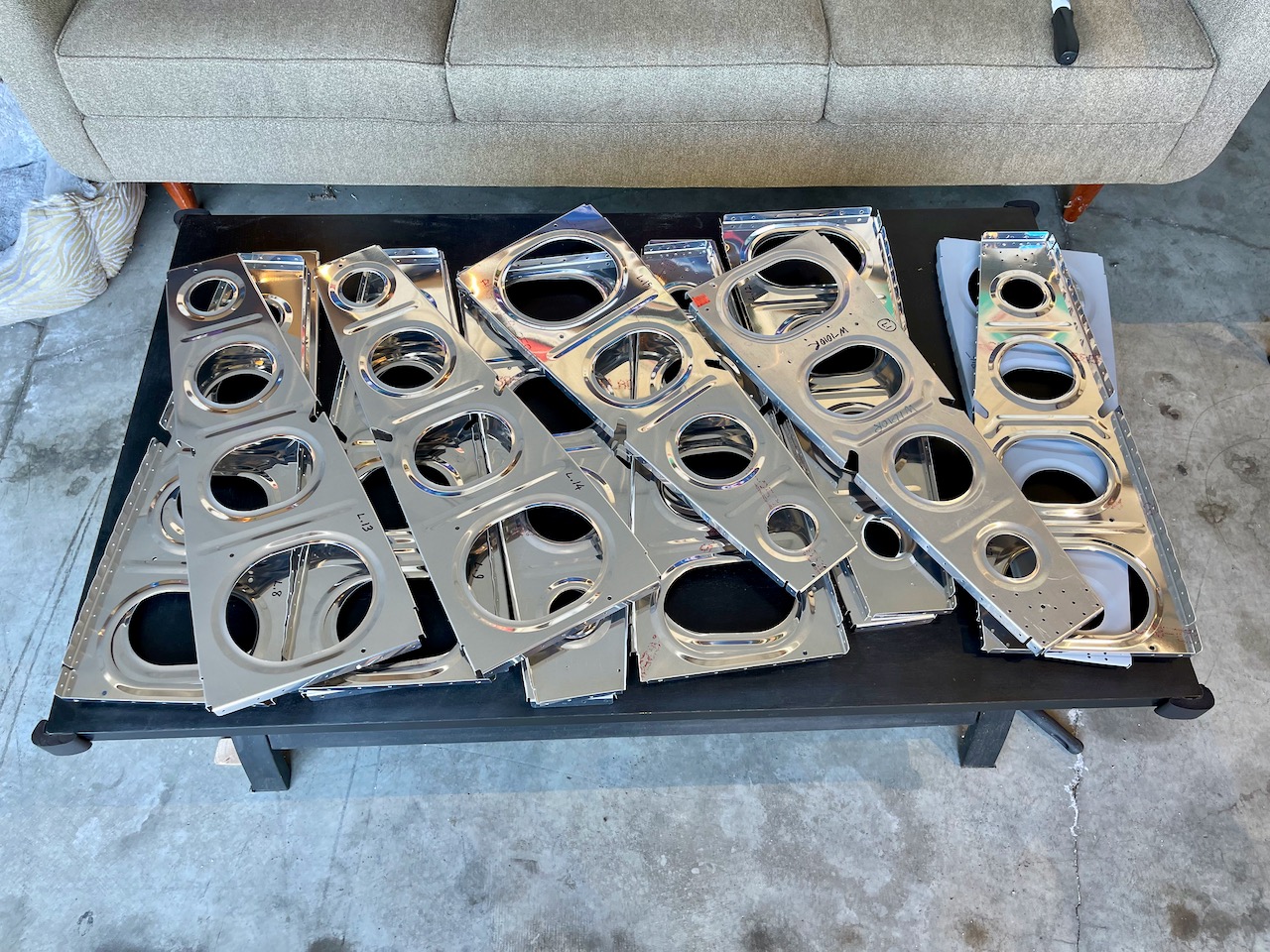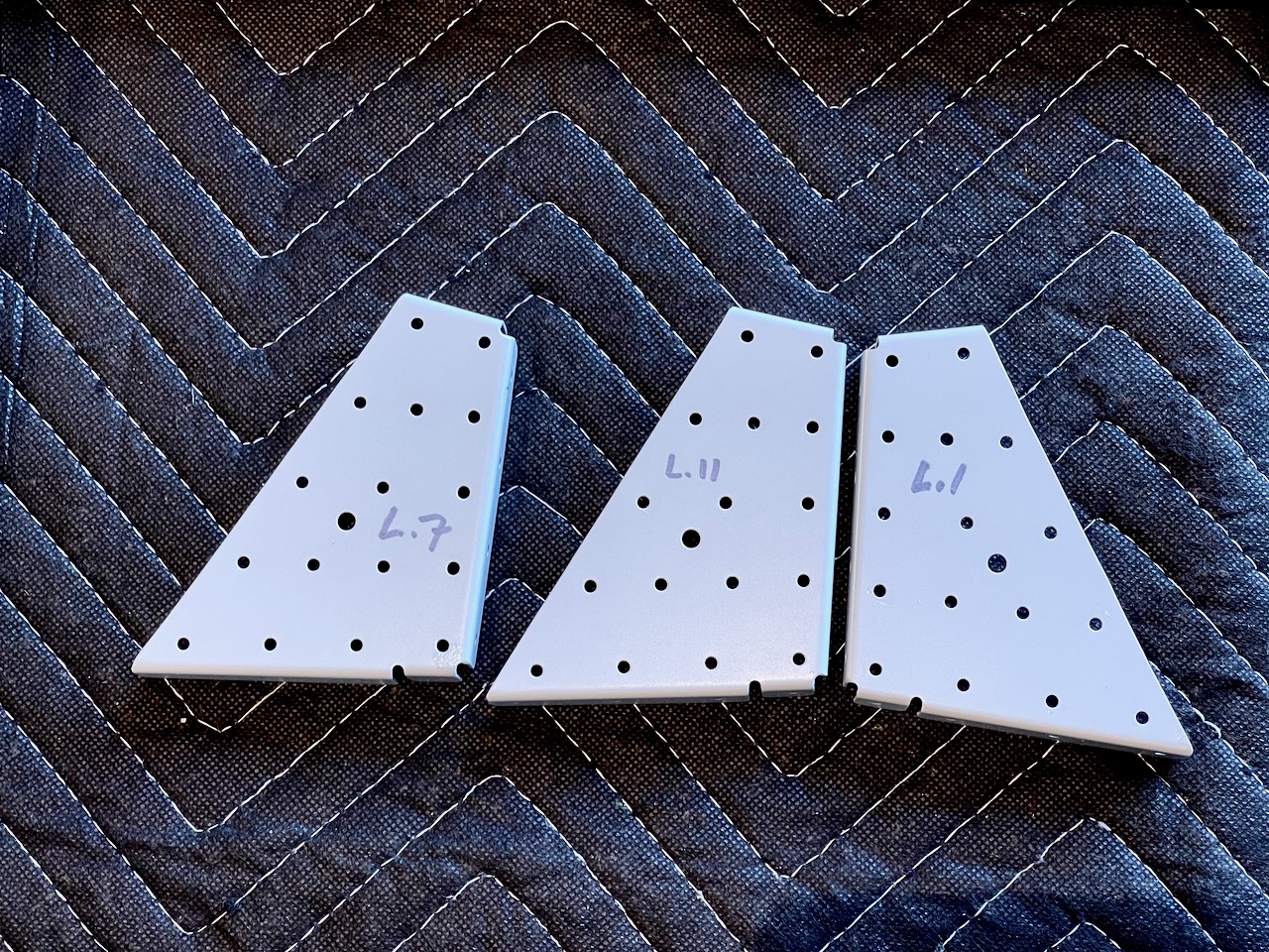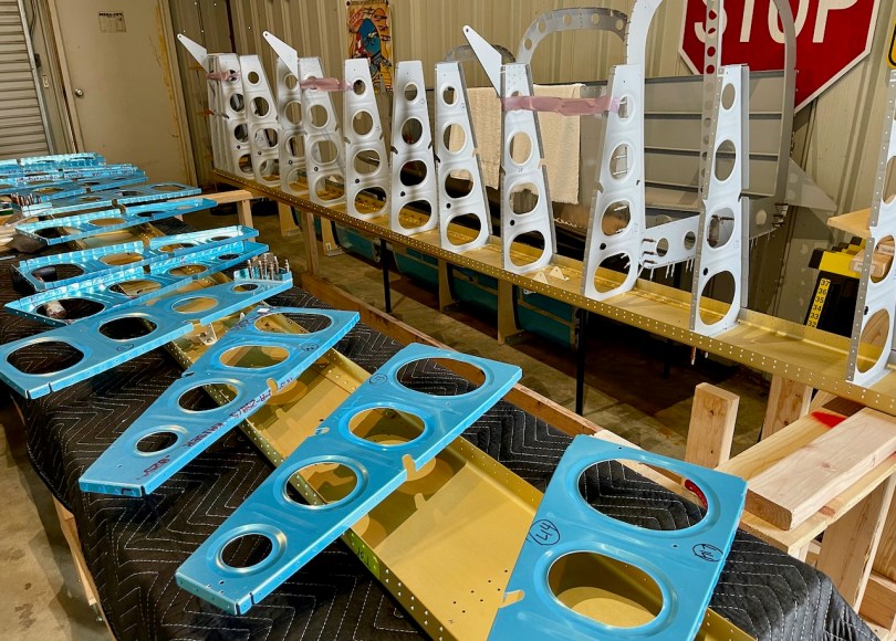 Finally resuming work on the left wing. It was a beautiful day today and nice and warm in the hangar. Spent time assigning the appropriate wing rib parts to their specific positions on the spar, clecoing them in place, and them match drilling #12 holes for bolts. Again the #30 and #40 holes are final sized so no drilling required there. Also pulled off the blue vinyl from the wing ribs, and finally begun the deburring and priming process on three of the smaller parts (brackets).