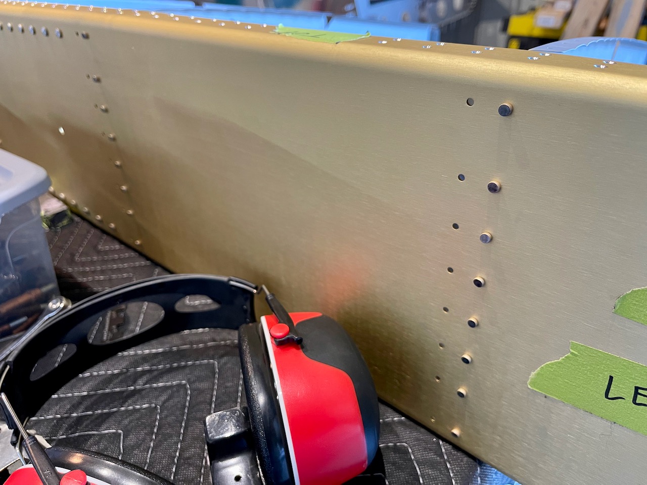 Riveted the left main ribs onto the left wing spar. This went quite well, but a few had to be drilled out and re-set (mostly due to bucking bar slippage). Same issue I had with the right wing. Switched to the large bucking bar, the small tungsten one is too dainty, in general, to hold with the higher pressure for driving the #4 rivets.