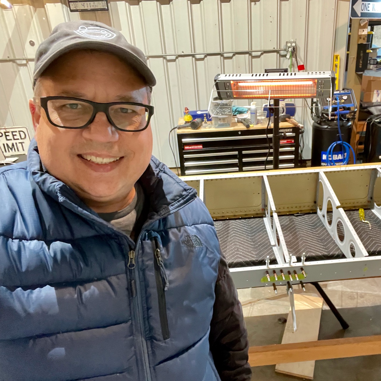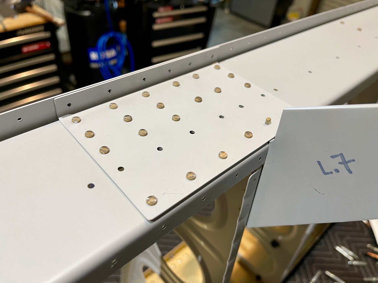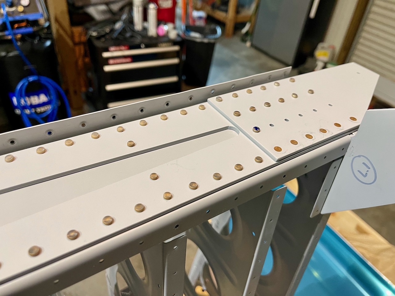 Almost complete. Only a couple of rivets that cannot be reached easily with the squeezer that I will have to use the riveting gun. One mistake… riveted a hole that was supposed to have been left open, I pulled the “do not rivet” tape off to early. I also left off the aileron attach bracket, I’m still waiting to see if I need to adjust the angle aluminum on these to make certain surfaces flush riveted.