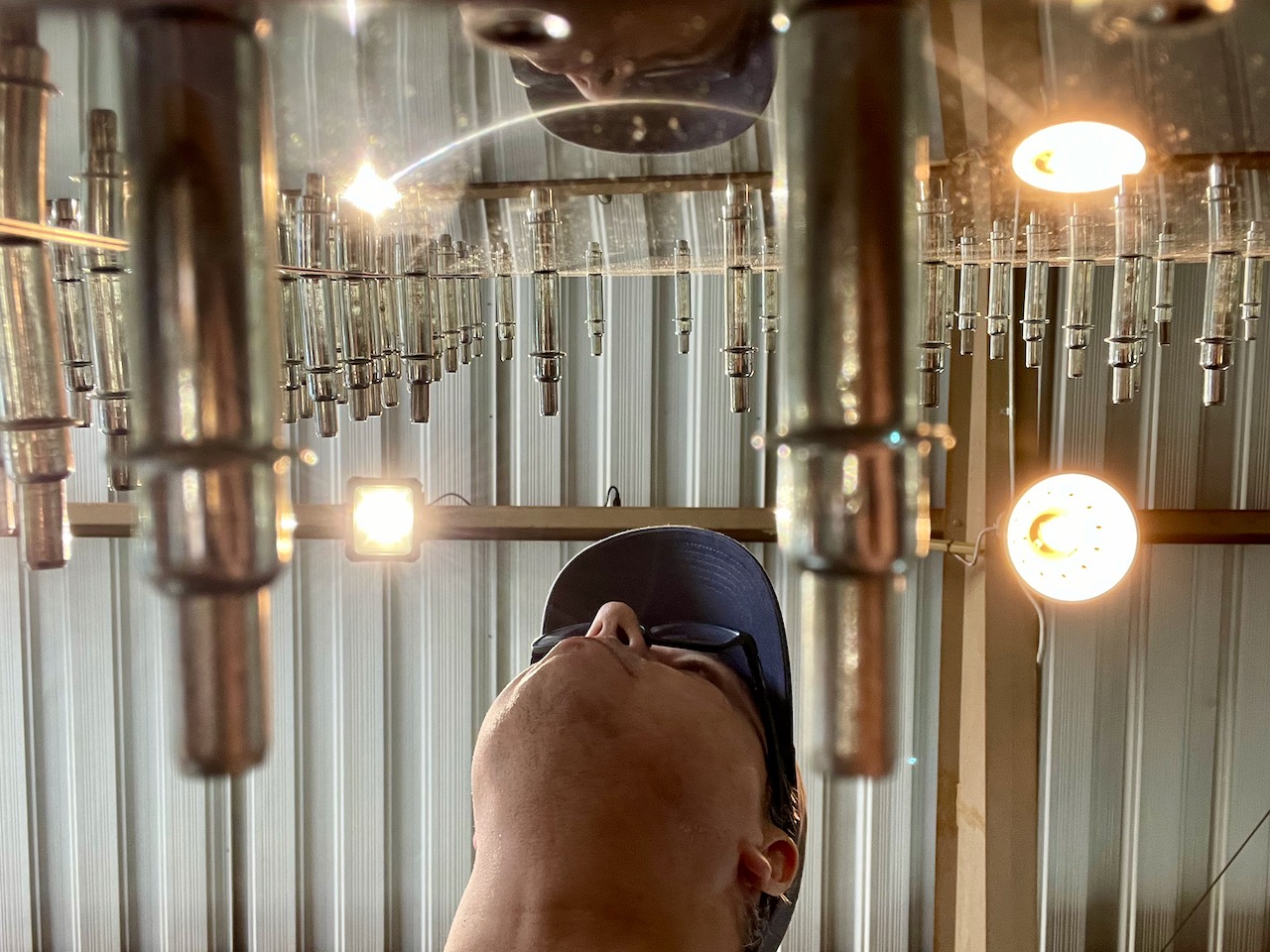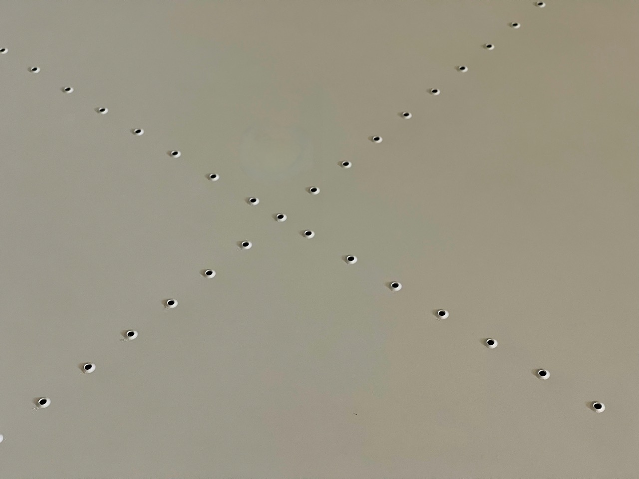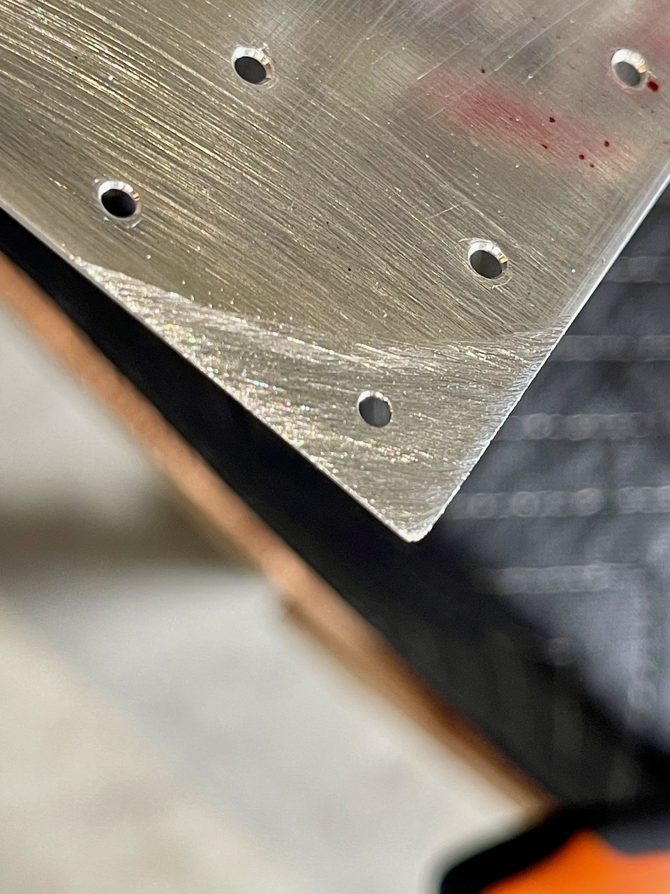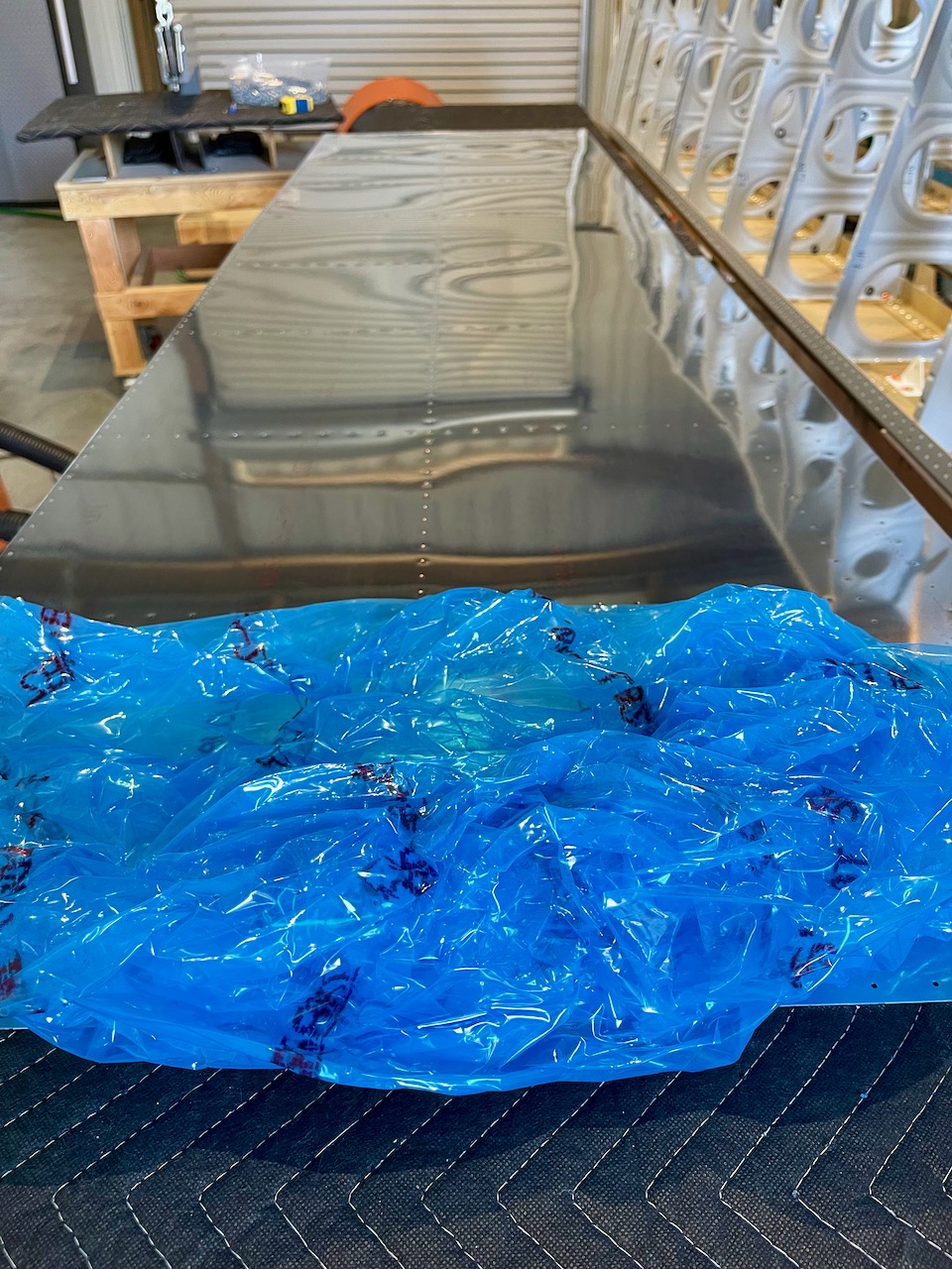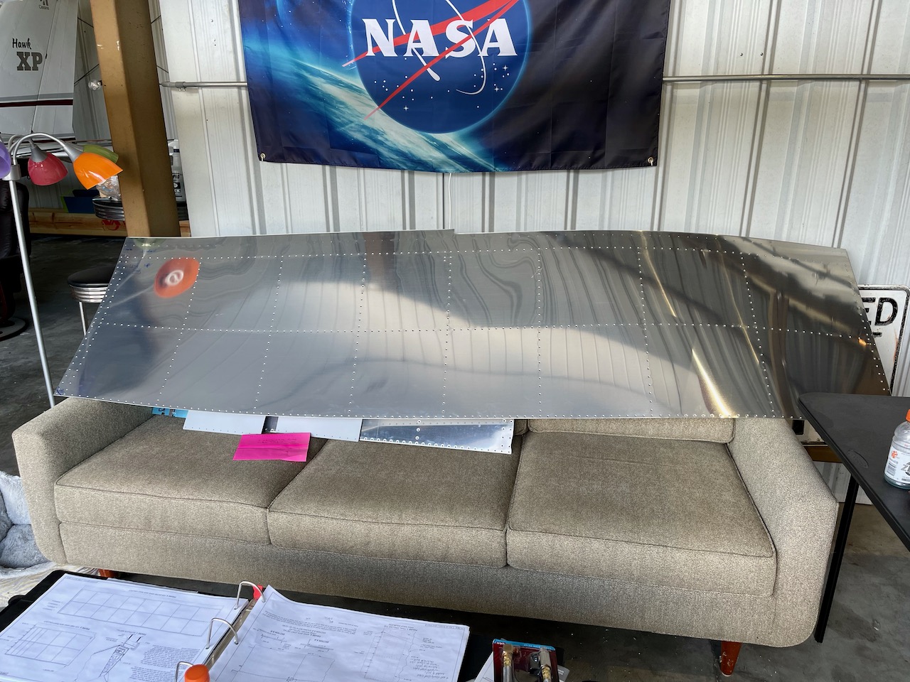 Really glad I made my dimpler table and platform the same height as my workbenches, so that I can use the workbenches as out-tables. This was really useful with the 9′ skin (shown on sofa for scale, and because I needed a place to briefly put it!).