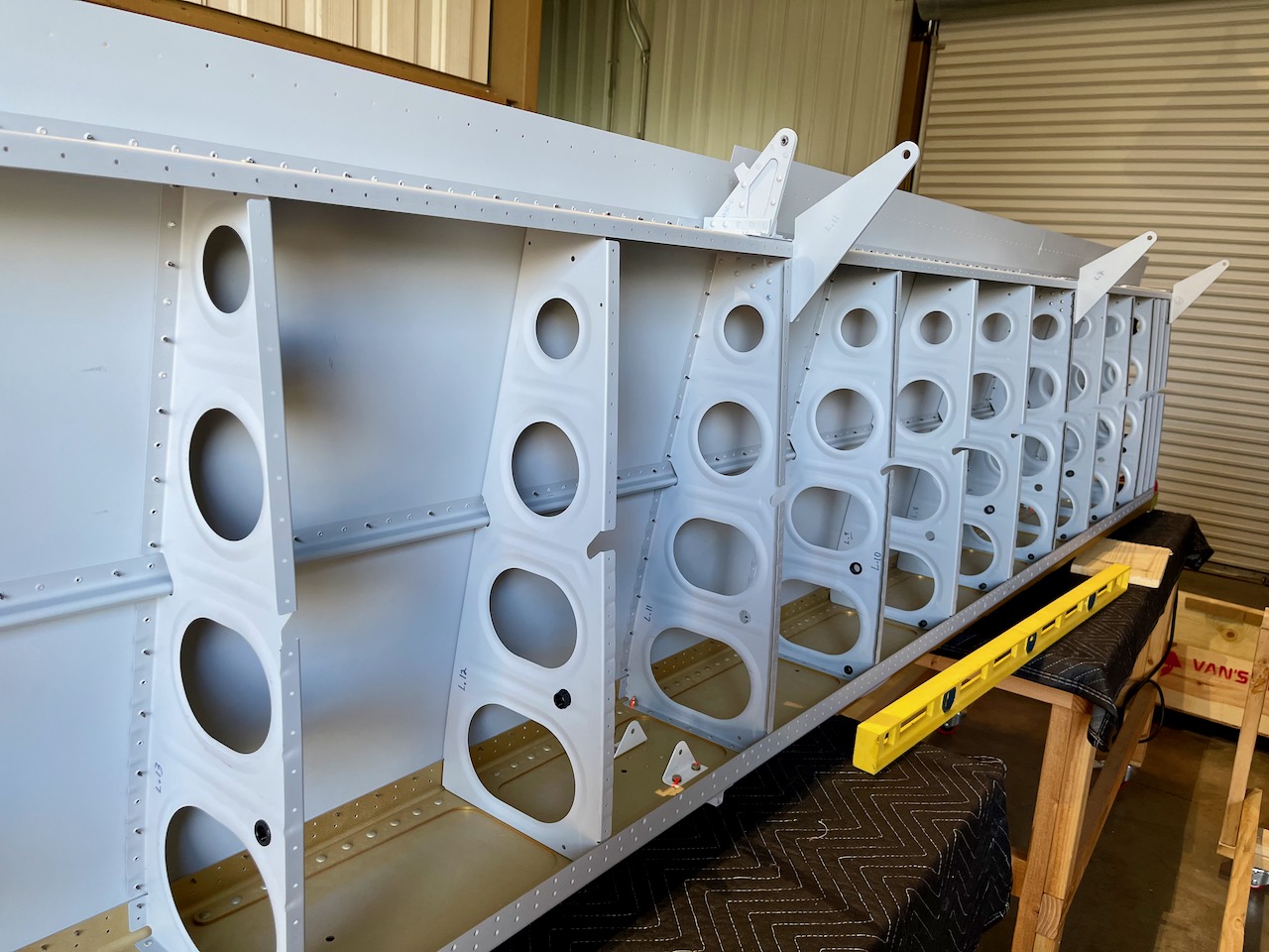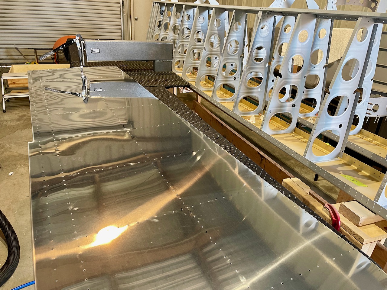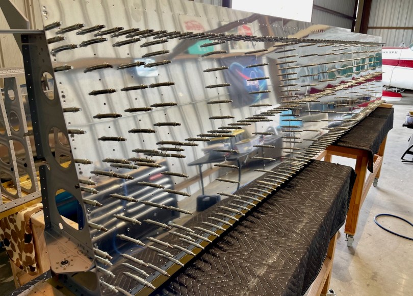 This entry contains work done this weekend and prior. All the prep work for the left wing top skins has been completed. This included laborious tasks including edge deburring, hole deburring, some corner skin joint filing and sanding, dimpling and priming. Finally all skins and doubler plates have been clecoed in place. Ready for riveting!