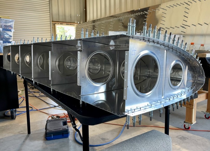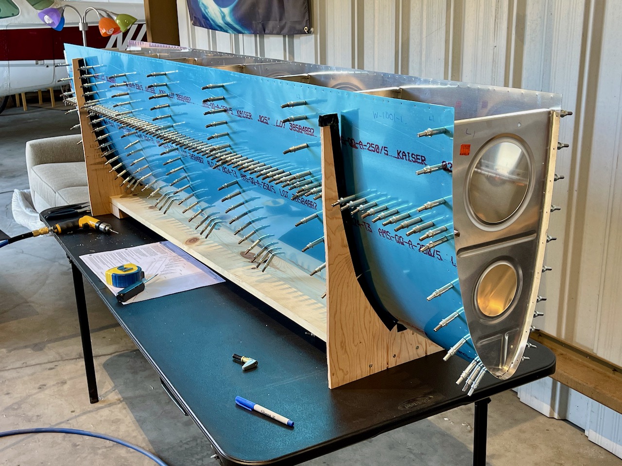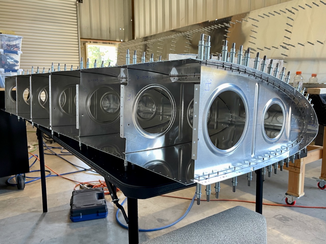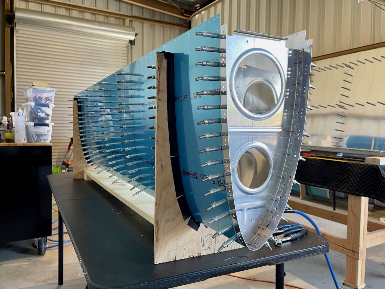 Cleco’d in all the leading edge ribs with the J-stiffener inserted. Match drilled the J-stiffener and final size drilled the ribs. The ribs were orange tagged (meaning not final sized) but the skins were final sized… the rib holes seemed to be big enough but because there is considerable fluting required, decided to go all-in with the match drilling. Pro-tip: definitely easiest to cleco the nose tip portions in first.