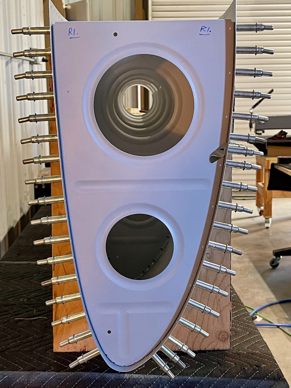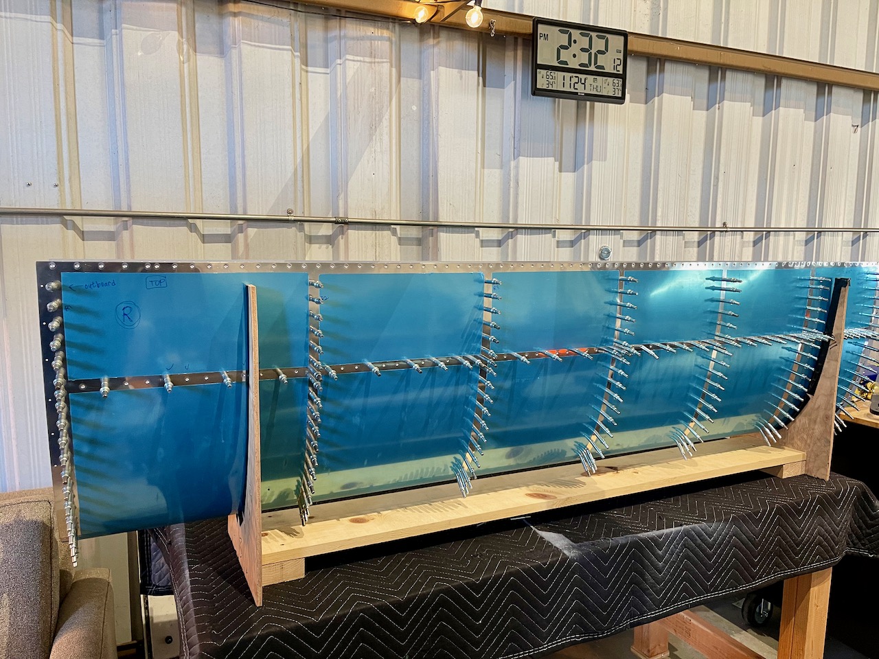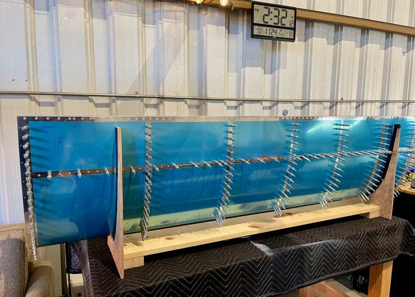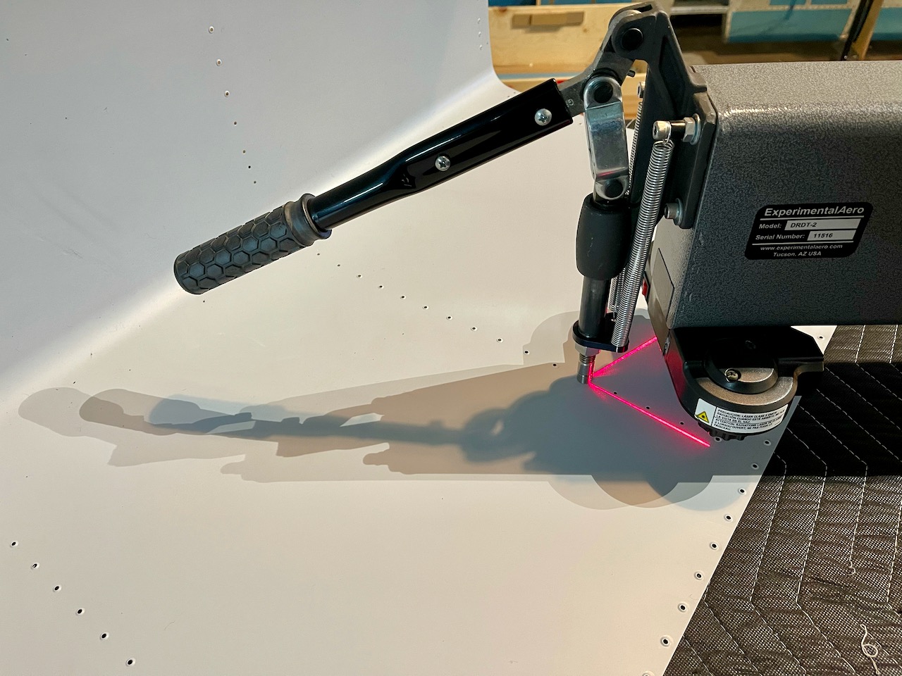 Today was dimpling day. Dimpling the stiffener, tank attachment strip, and skin for the right wing leading edge. Then several nutplates had to be riveted to the tank attach strip. Finally, all the parts were reassembled and clecoed … ready for riveting!