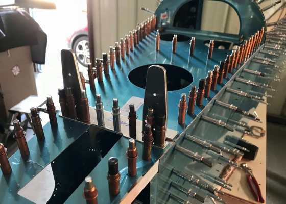 Riveting together the smaller bulkheads and accompanying pieces that go to the aft end of the tailcone. Required the use
